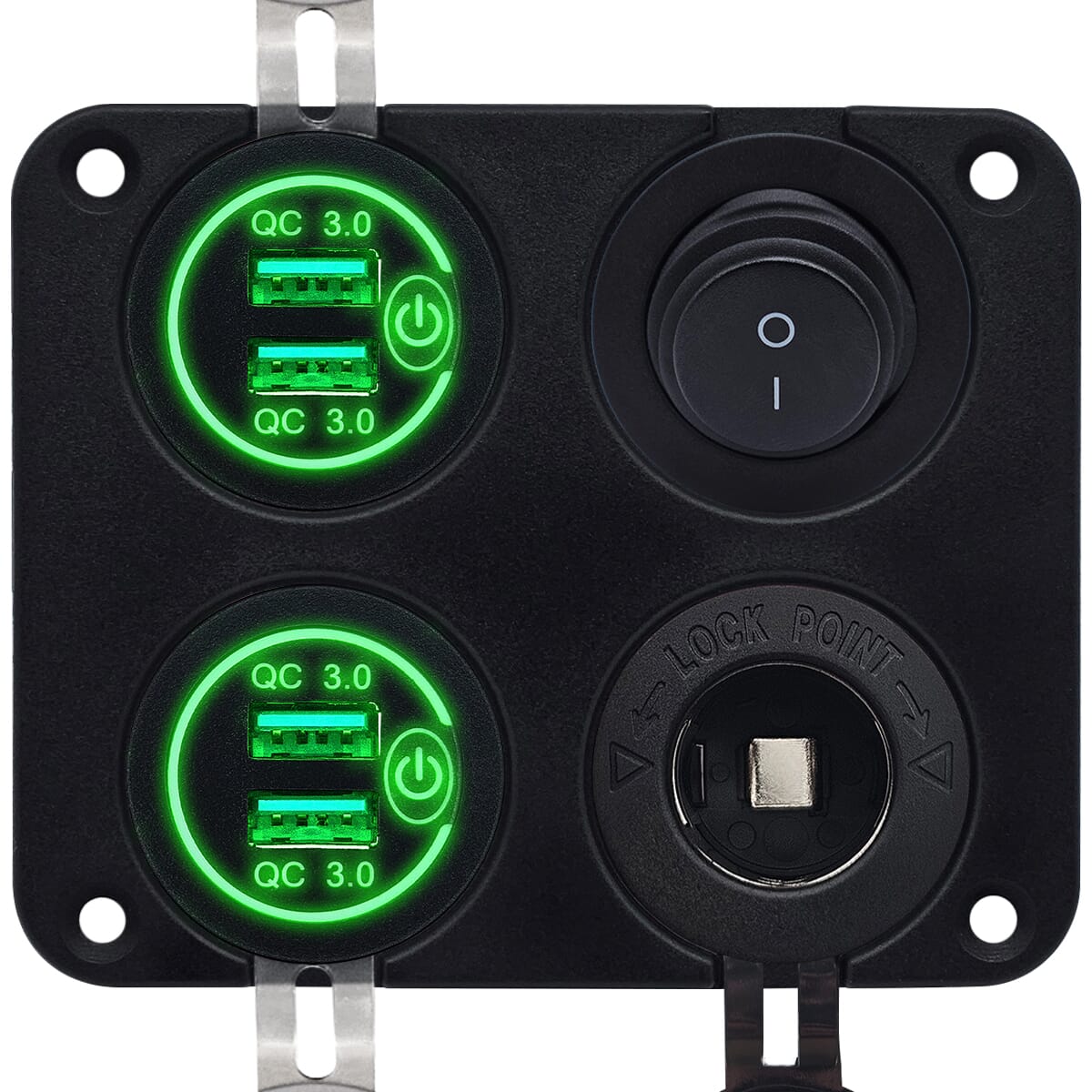 ProRide 12V USB Autolader 4 Poorten – QC3.0 – Schakelaar en 12V Sigaretten stopcontact – Vierkant inbouw