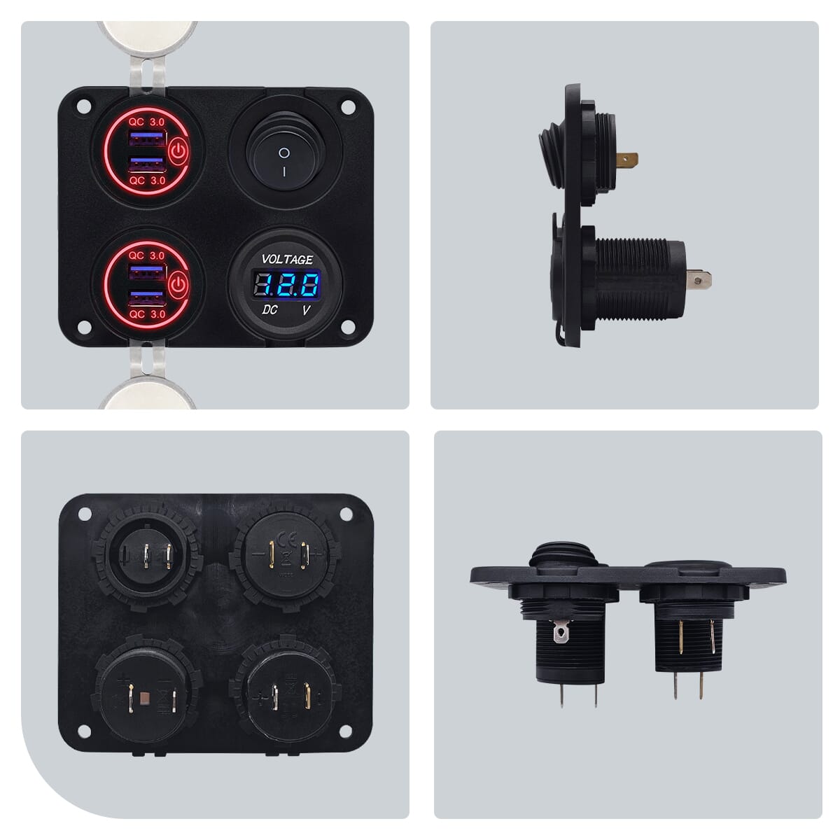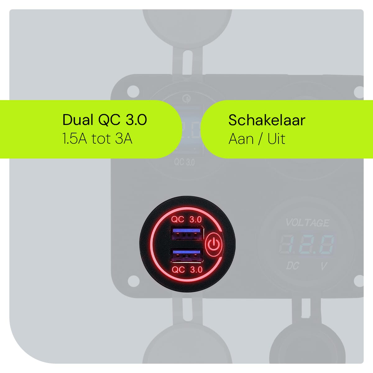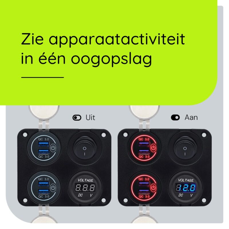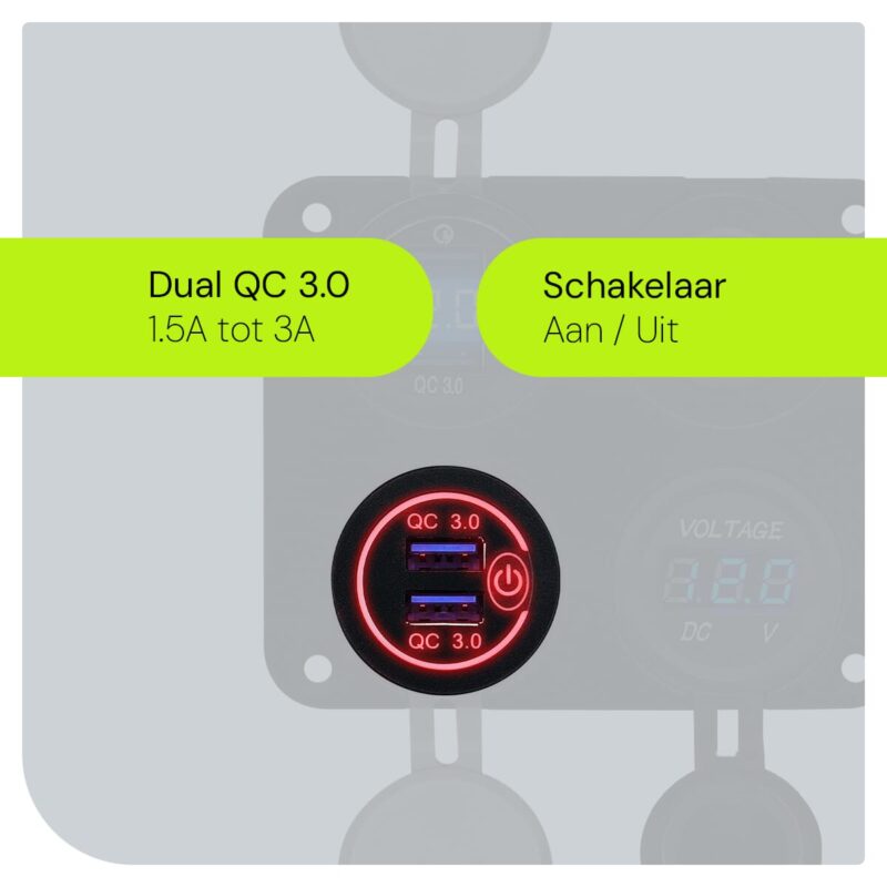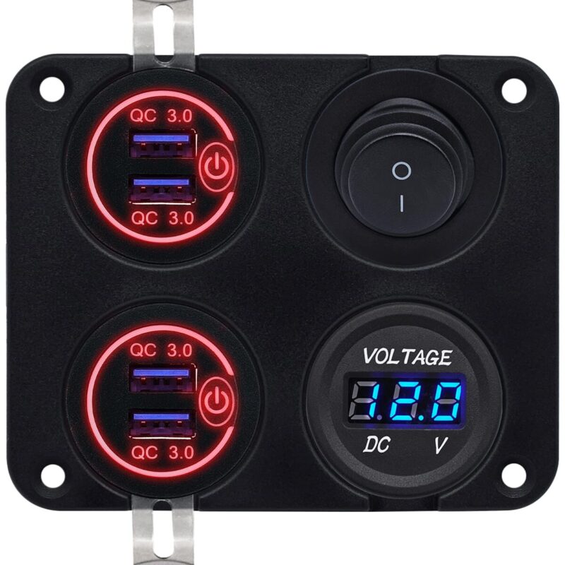 ProRide 12V USB Autolader 4 Poorten – QC3.0 – Voltmeter en Schakelaar – Vierkant inbouw