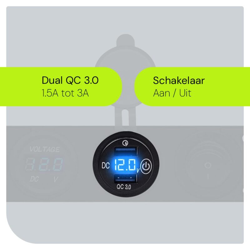 ProRide 12V USB Autolader 4 Poorten – QC3.0 – Voltmeter en Schakelaar – Viervoudig inbouw
