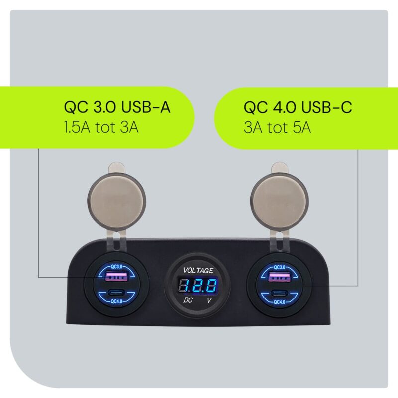 ProRide 12V USB Autolader 4 Poorten – QC4.0 – P129565 – Drievoudig opbouw met Voltmeter