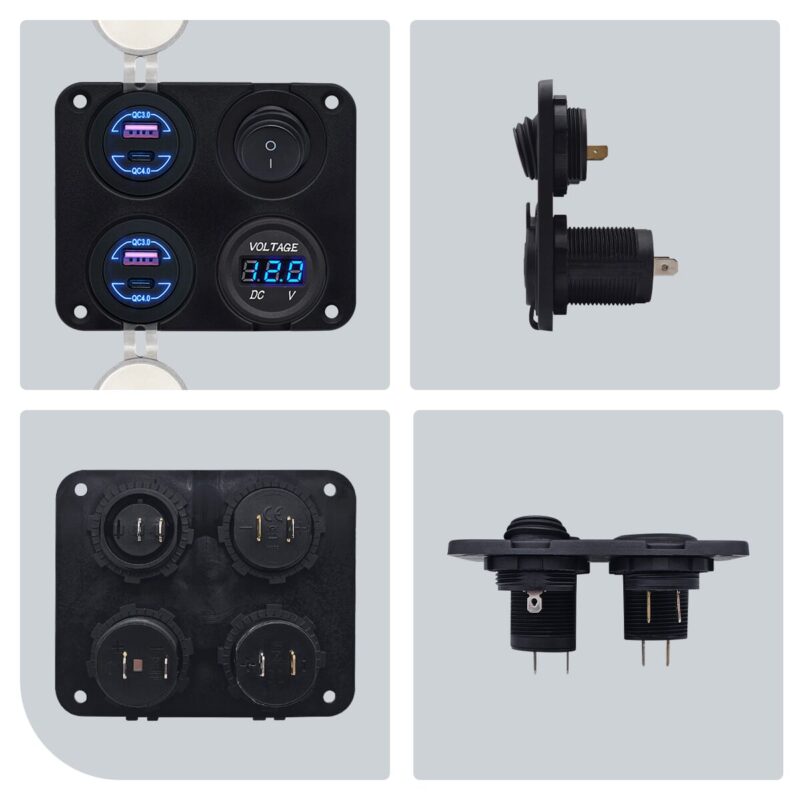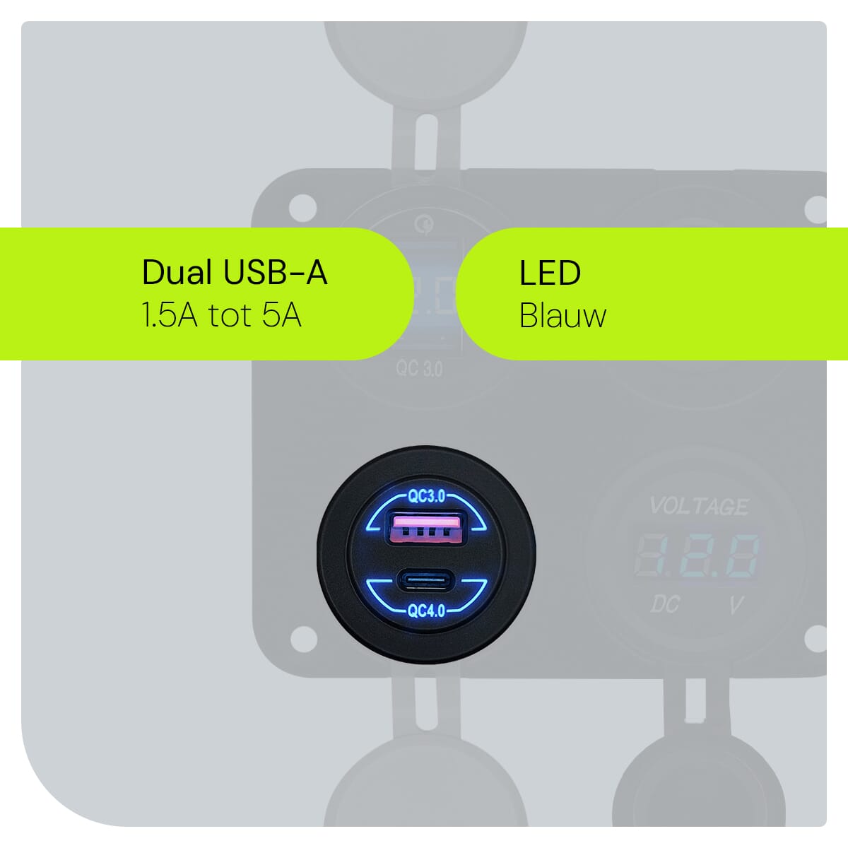 ProRide 12V USB Autolader 4 Poorten – QC4.0 – Voltmeter en Schakelaar – Vierkant inbouw