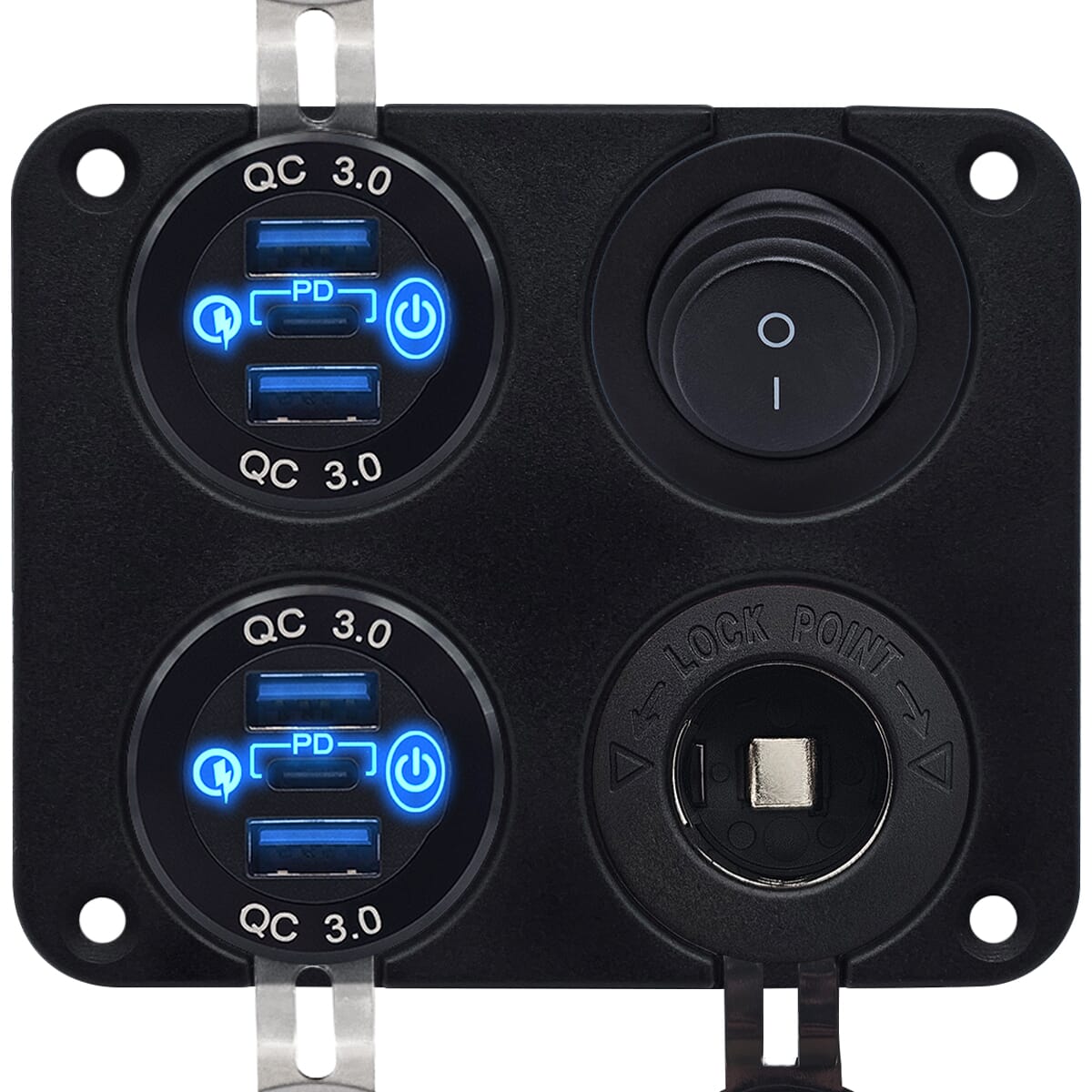 ProRide 12V USB Autolader 6 Poorten – QC3.0 – Schakelaar en 12V Sigaretten stopcontact – Vierkant inbouw