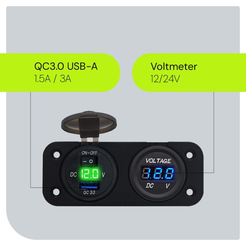 ProRide 12V USB Autolader Inbouw met Schakelaar/Voltmeter – 5V/2.4A – Tweevoudig inbouw paneel – Groen