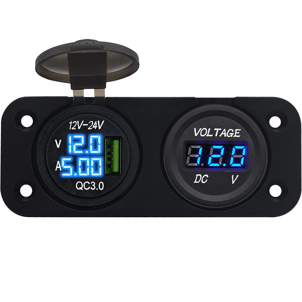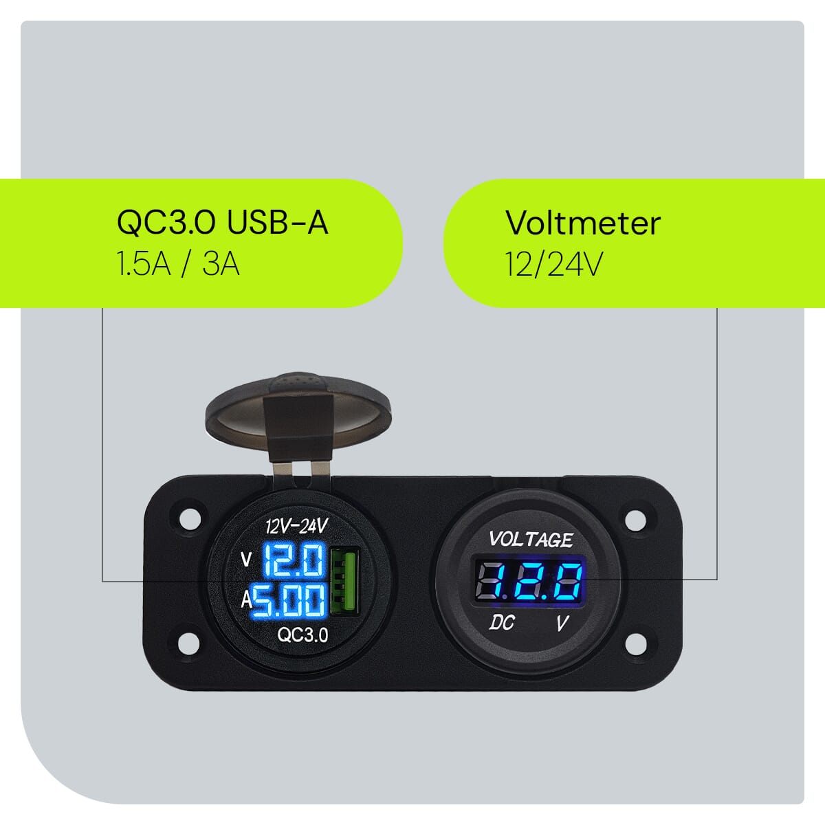 ProRide 12V USB Autolader Inbouw met Voltmeter/Ampèremeter – QC3.0 – Tweevoudig inbouw paneel