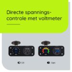 - Veiligheid: De ingebouwde voltmeter en schakelaar zorgen ervoor dat je altijd de controle hebt over je stroomverbruik en de status van je accu.