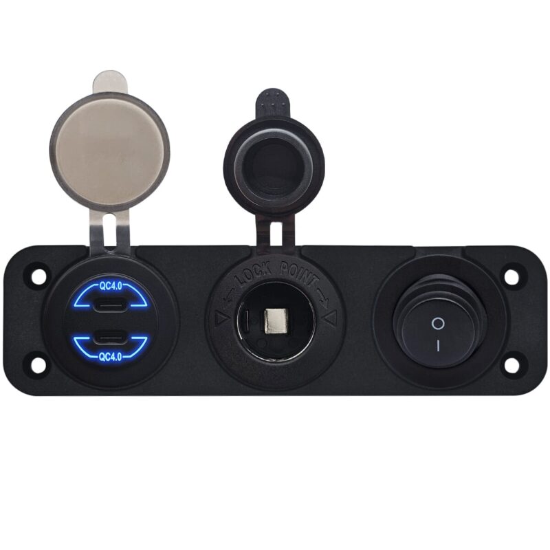 ProRide 12V USB C Autolader 2 Poorten – 30W/QC4.0 – Drievoudig inbouw paneel – Sigaretten stopcontact en Schakelaar