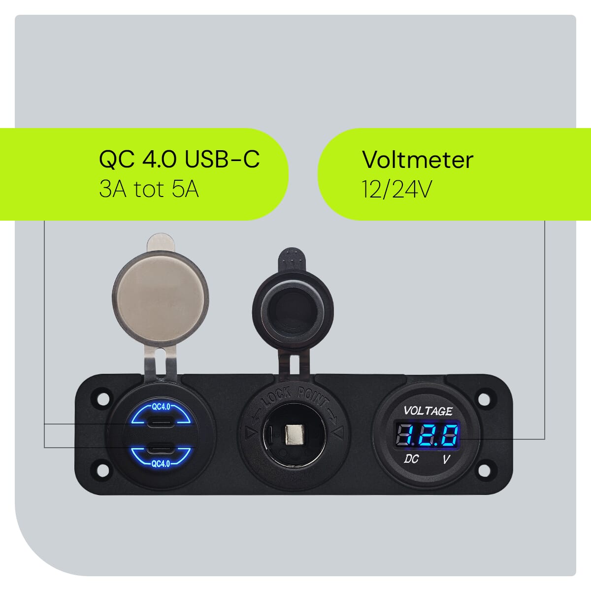 ProRide 12V USB C Stopcontact 2 Poorten – 30W/QC4.0 – Voltmeter, Schakelaar en 12V/24V Sigarettenplug – Drievoudig Inbouw