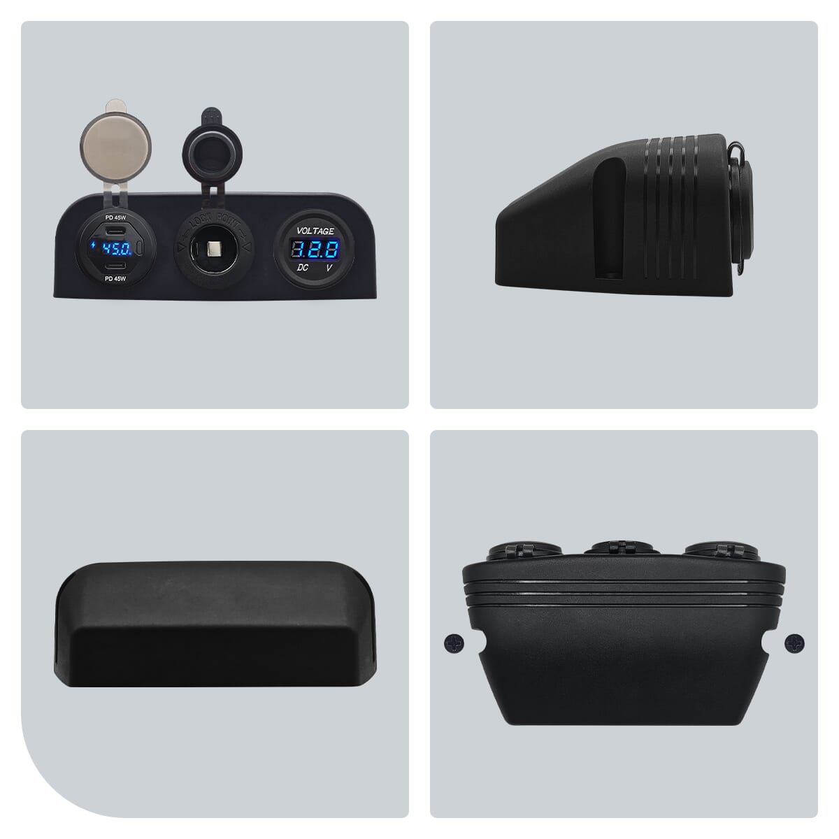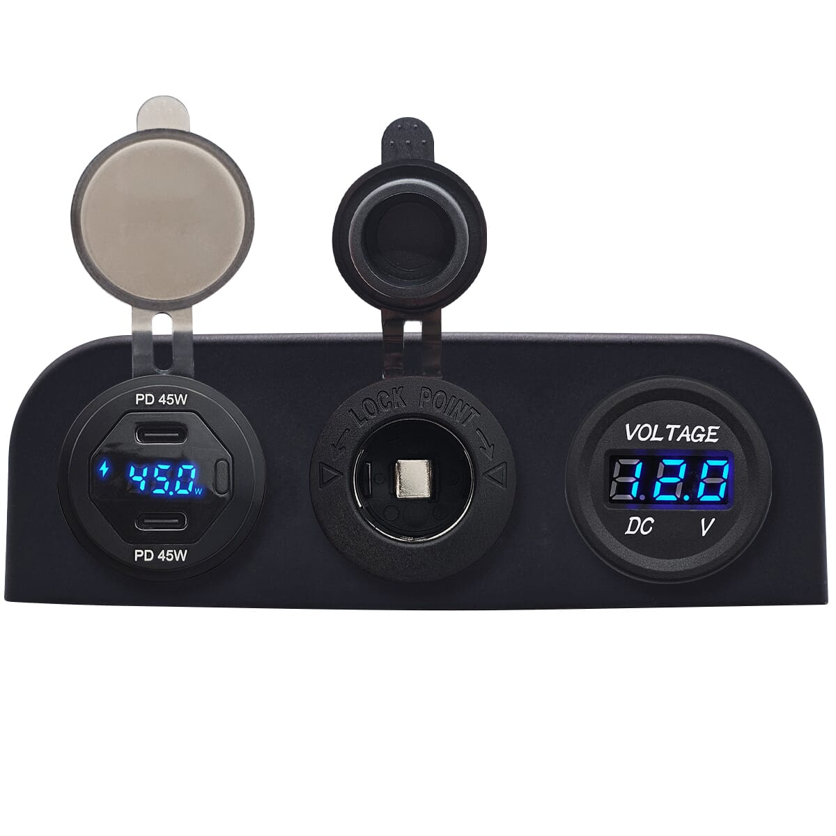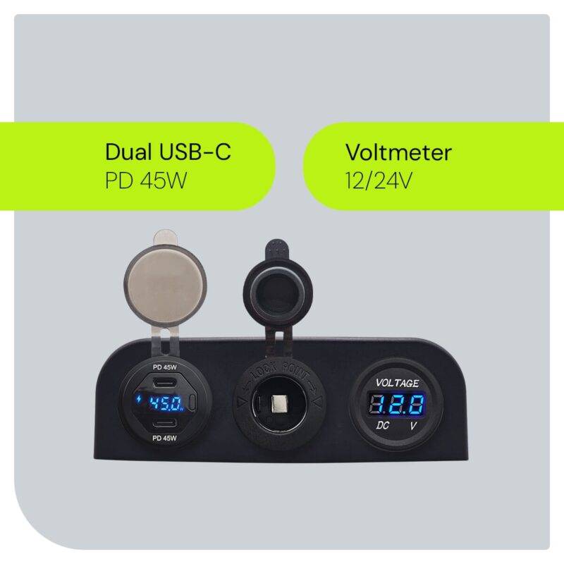 ProRide 12V USB C Stopcontact 2 Poorten – 45W/QC3.0 – Voltmeter, Schakelaar en 12V/24V Sigarettenplug – Drievoudig Opbouw