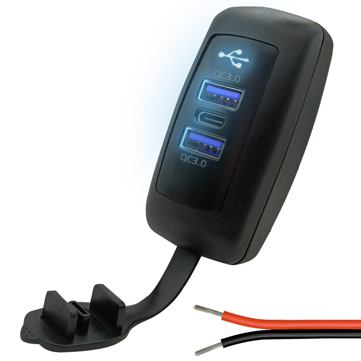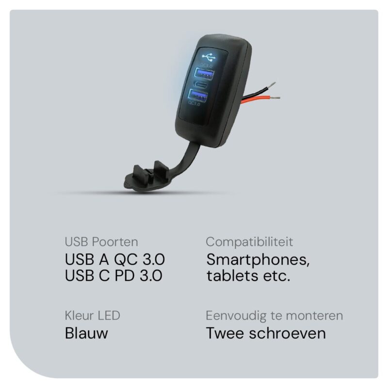 ProRide 12V USB C Autolader 3 Poorten Opbouw – 2x USB A + USB C Stopcontact Auto, Boot en Camper – QC3.0 Snellader – Complete set – Blauw