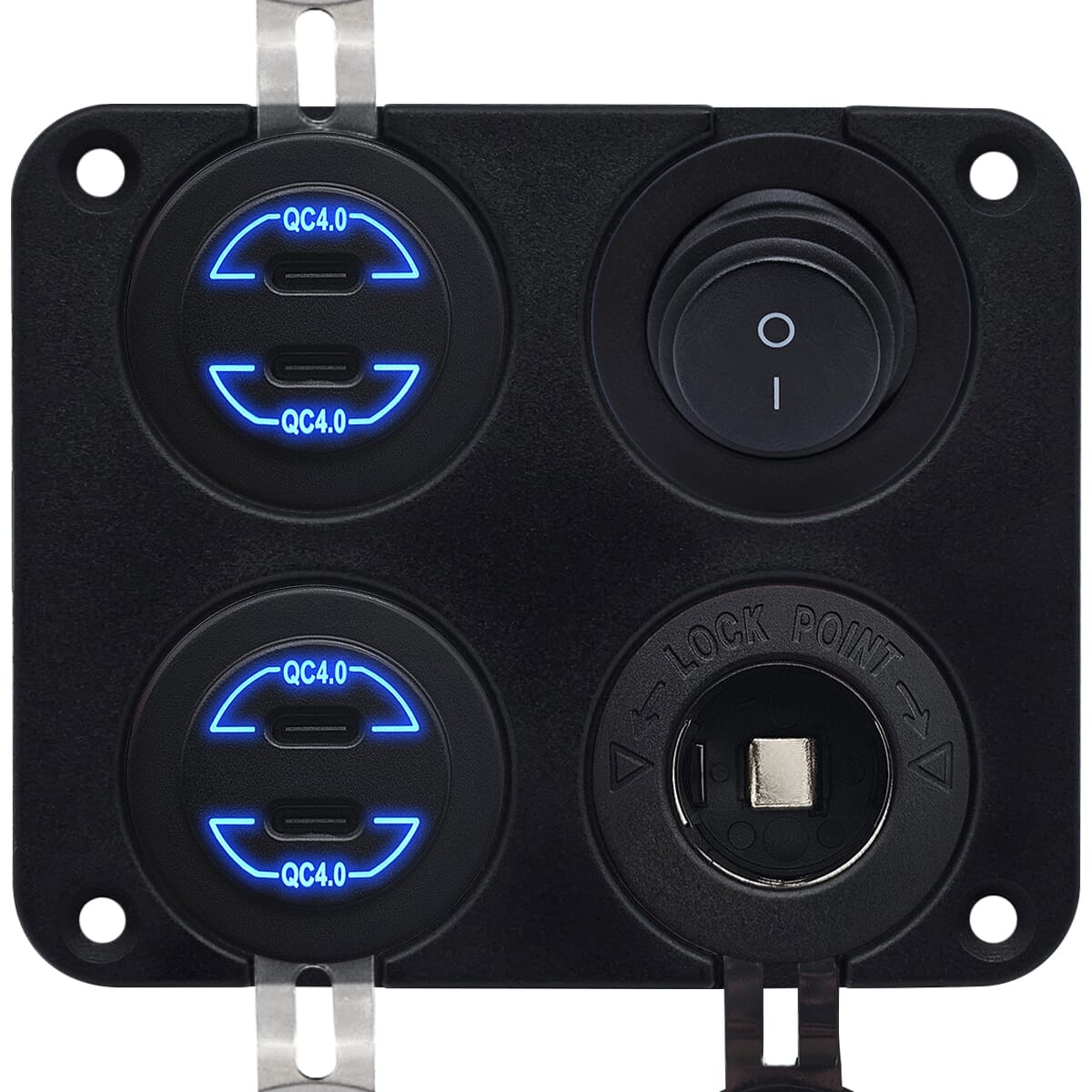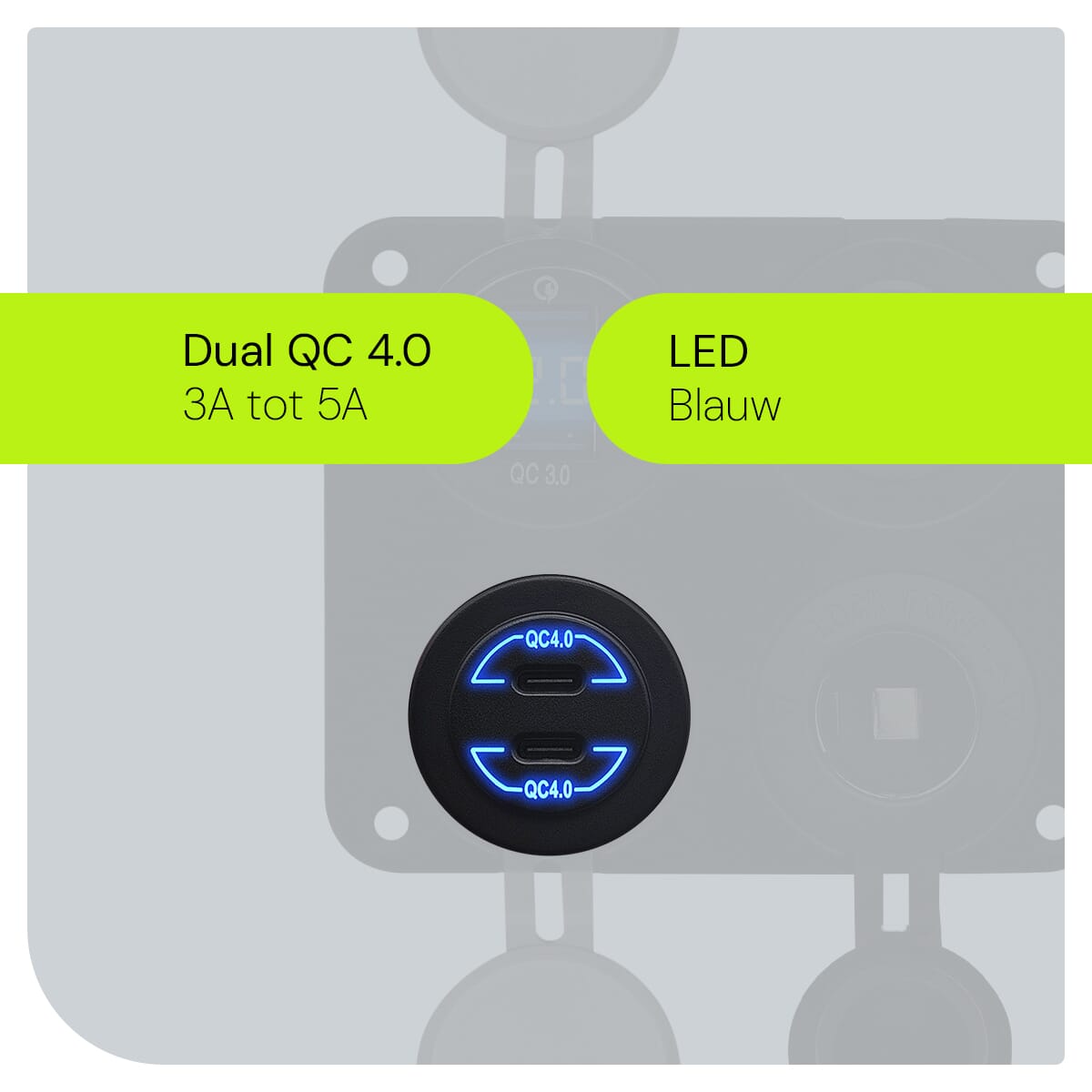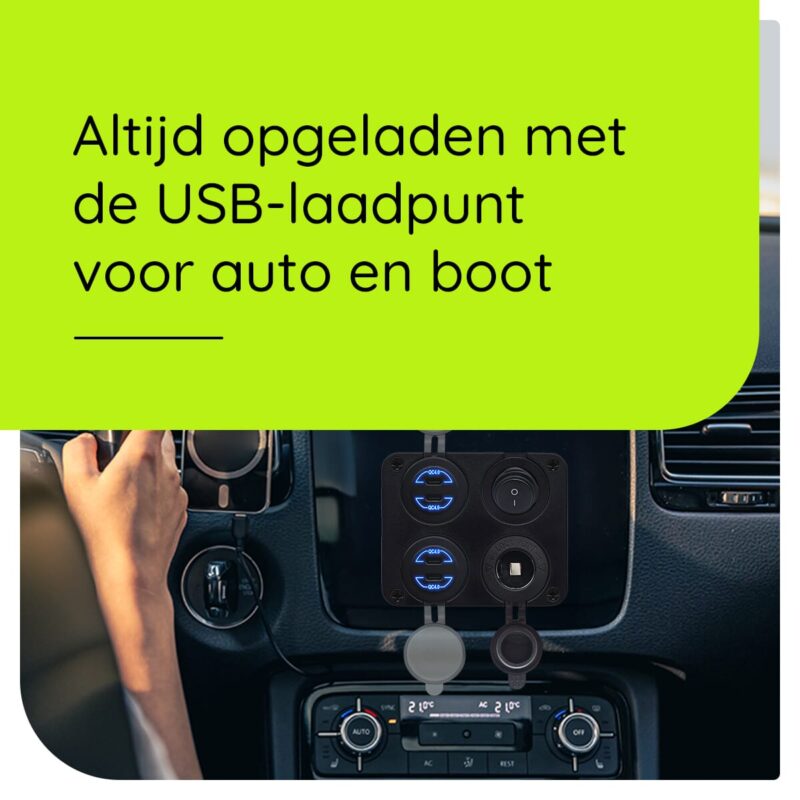 ProRide 12V USB C Autolader 4 Poorten – 30W/QC4.0 – Schakelaar en 12V Sigaretten stopcontact – Vierkant inbouw
