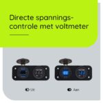 De ingebouwde voltmeter geeft je in één oogopslag inzicht in de status van je accu, zodat je altijd weet of alles naar behoren werkt. De schakelaar zorgt ervoor dat je de stroomtoevoer eenvoudig kunt in- en uitschakelen, wat niet alleen handig is, maar ook de levensduur van je apparaten verlengt.