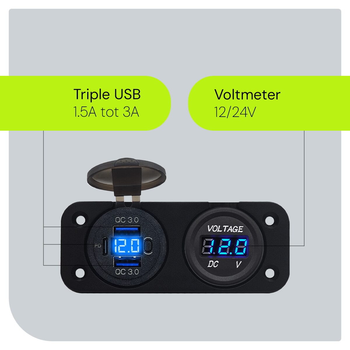 ProRide 12V USB C Stopcontact 3 Poorten Inbouw met Schakelaar/Voltmeter – QC3.0 – Tweevoudig inbouw paneel – Blauw