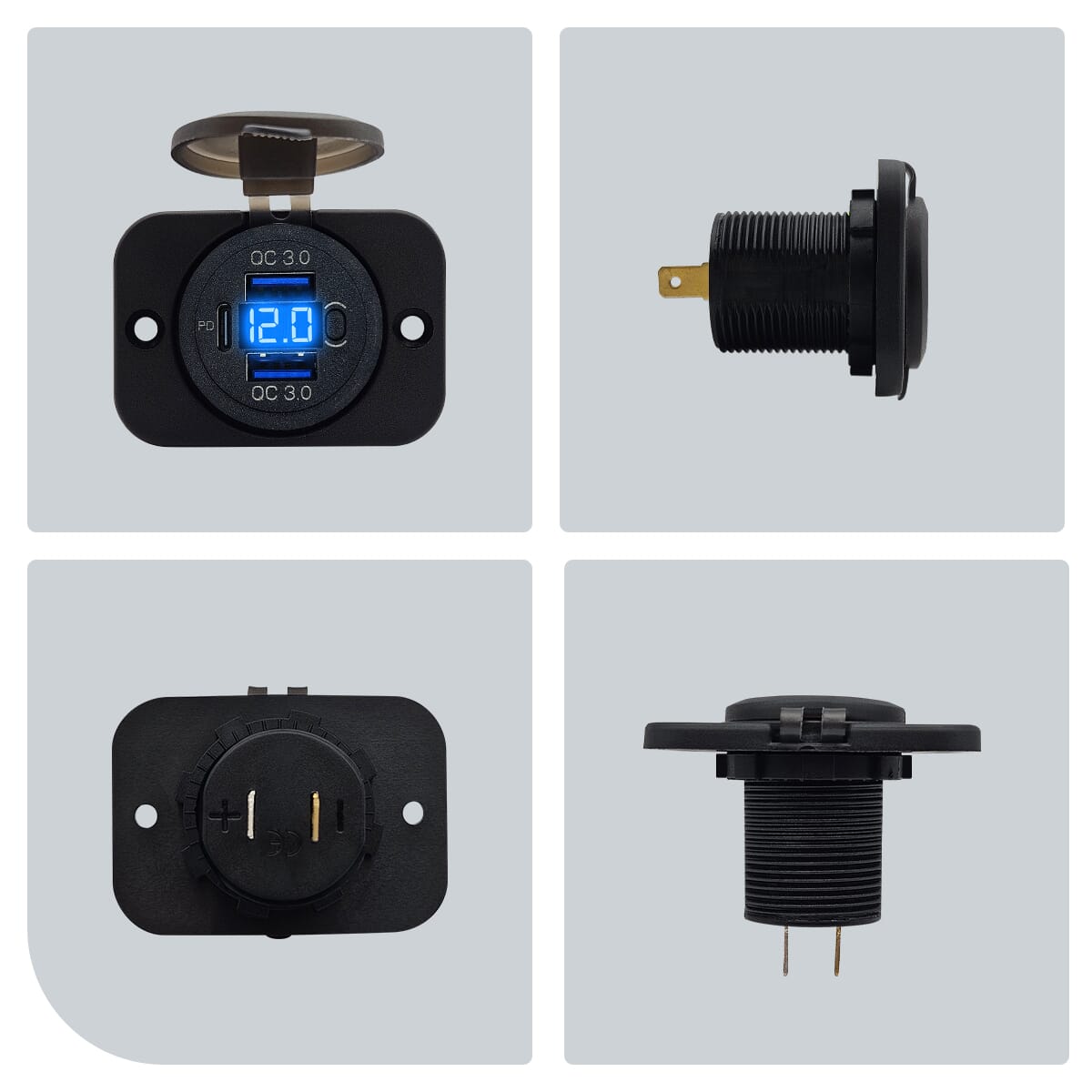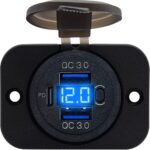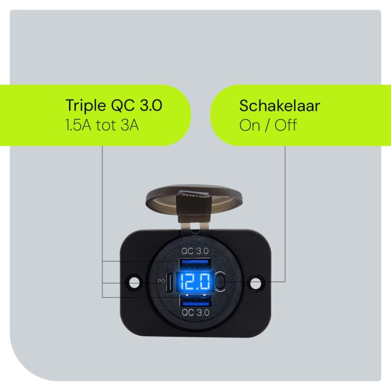 Monteer de autolader op een geschikte plaats in je voertuig en sluit deze aan op een 12V bron. Gebruik de USB-poorten om je apparaten op te laden en de schakelaar om de stroomtoevoer naar de lader te regelen. De voltmeter activeert automatisch om je real-time informatie over de staat van de accu te geven.