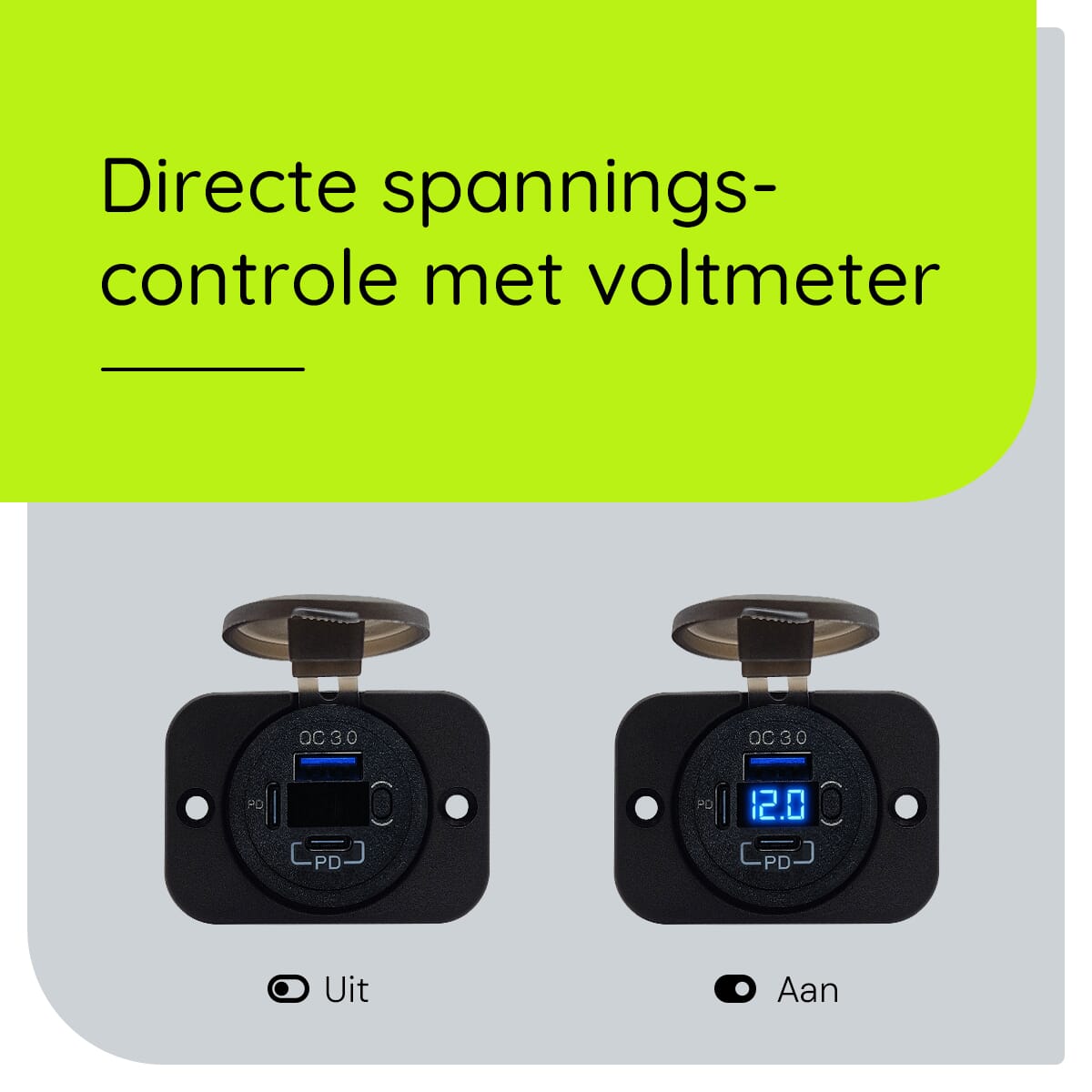 - Extra functies: Schakelaar en ingebouwde voltmeter