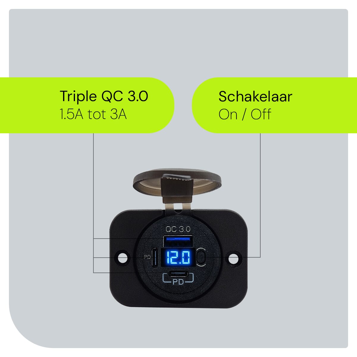 Zoek je een veelzijdige oplaadoplossing voor je voertuig? De ProRide® USB Autolader met drie poorten, schakelaar en voltmeter is de perfecte aanvulling voor je auto, vrachtwagen, boot, caravan of camper. Deze krachtige lader ondersteunt Quick Charge 3.0, waardoor je apparaten sneller opgeladen zijn.