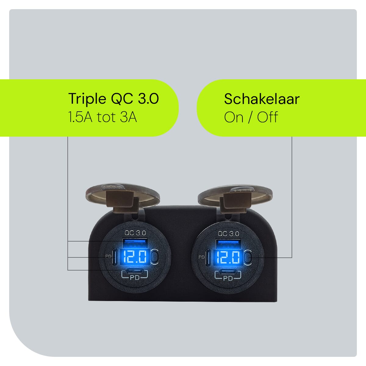 ProRide® 12V USB Boot-, camper en autolader met schakelaar – Tweevoudig opbouw