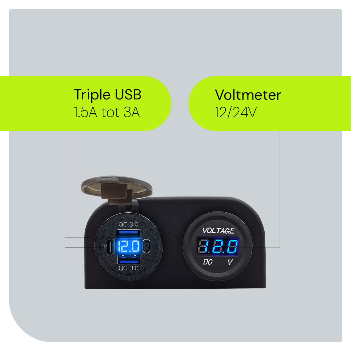 Met drie USB-poorten, waaronder een USB C-poort, biedt dit stopcontact voldoende aansluitmogelijkheden voor al je apparaten. De ingebouwde voltmeter geeft je direct inzicht in de batterijstatus van je voertuig, zodat je nooit voor verrassingen komt te staan.