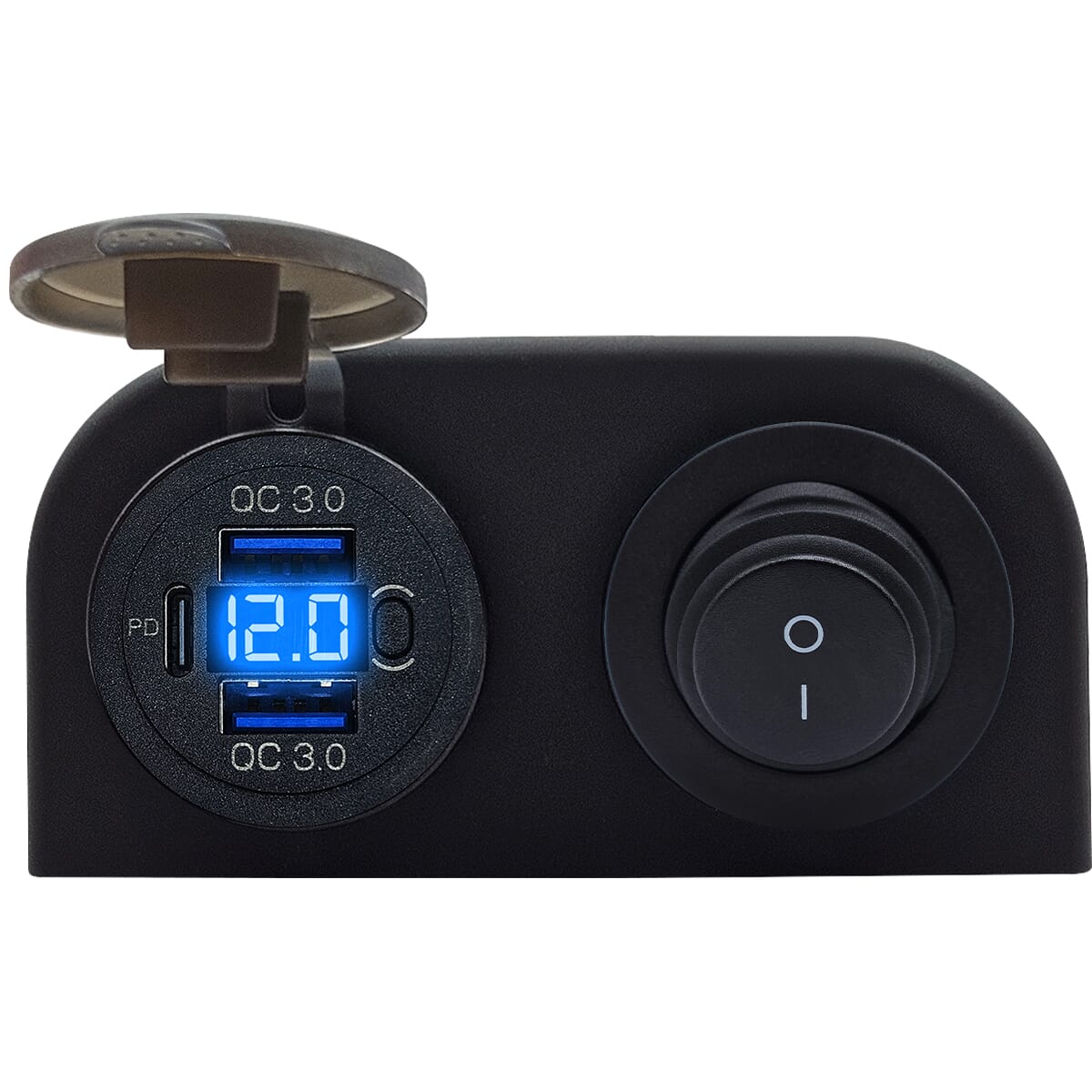 ProRide 12V USB C Stopcontact 3 Poorten Opbouw met Schakelaar/Voltmeter – QC3.0 – Tweevoudig opbouw – Blauw