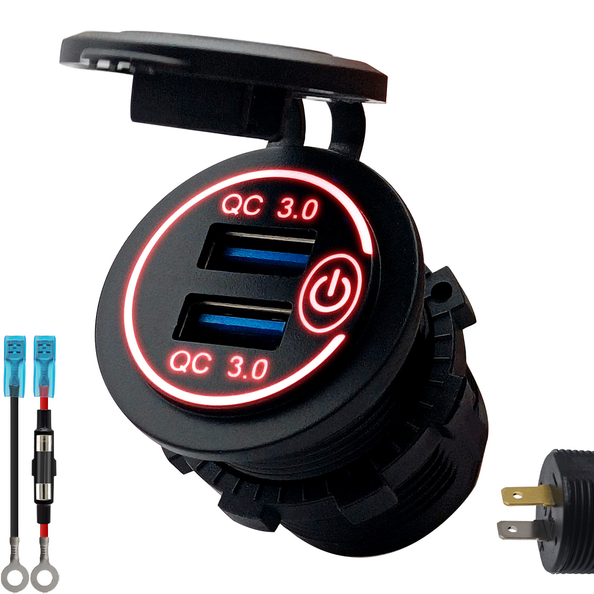 ProRide 12V USB Stopcontact 2 Poorten Inbouw met Schakelaar – QC3.0 – PUSB1QC-R – met Aansluitkabel 60cm en Glaszekering 10A – Rood