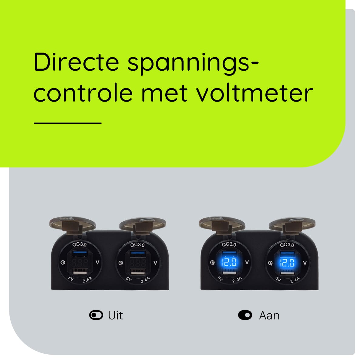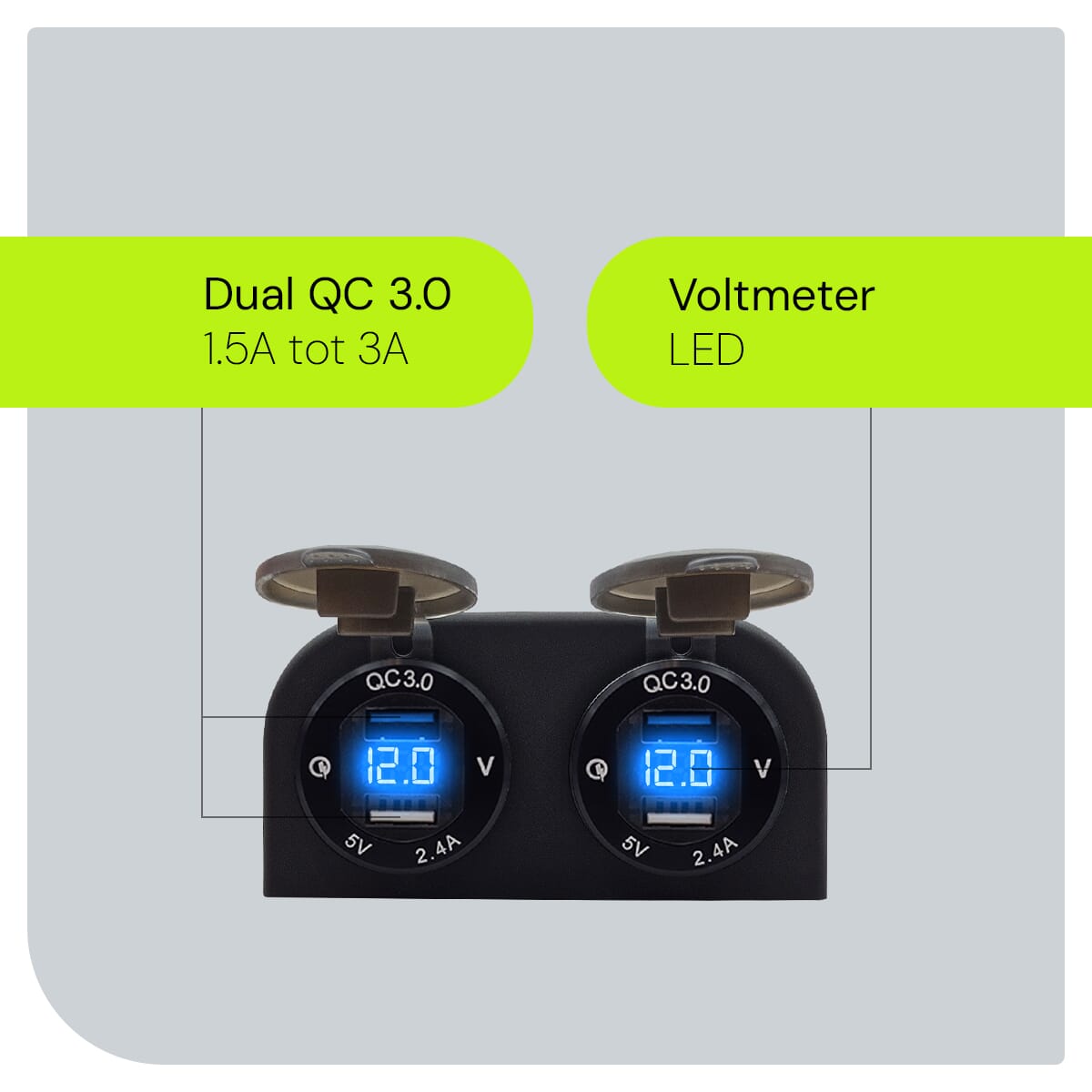 ProRide® 12V USB Boot-, camper en autolader met voltmeter – Tweevoudig opbouw