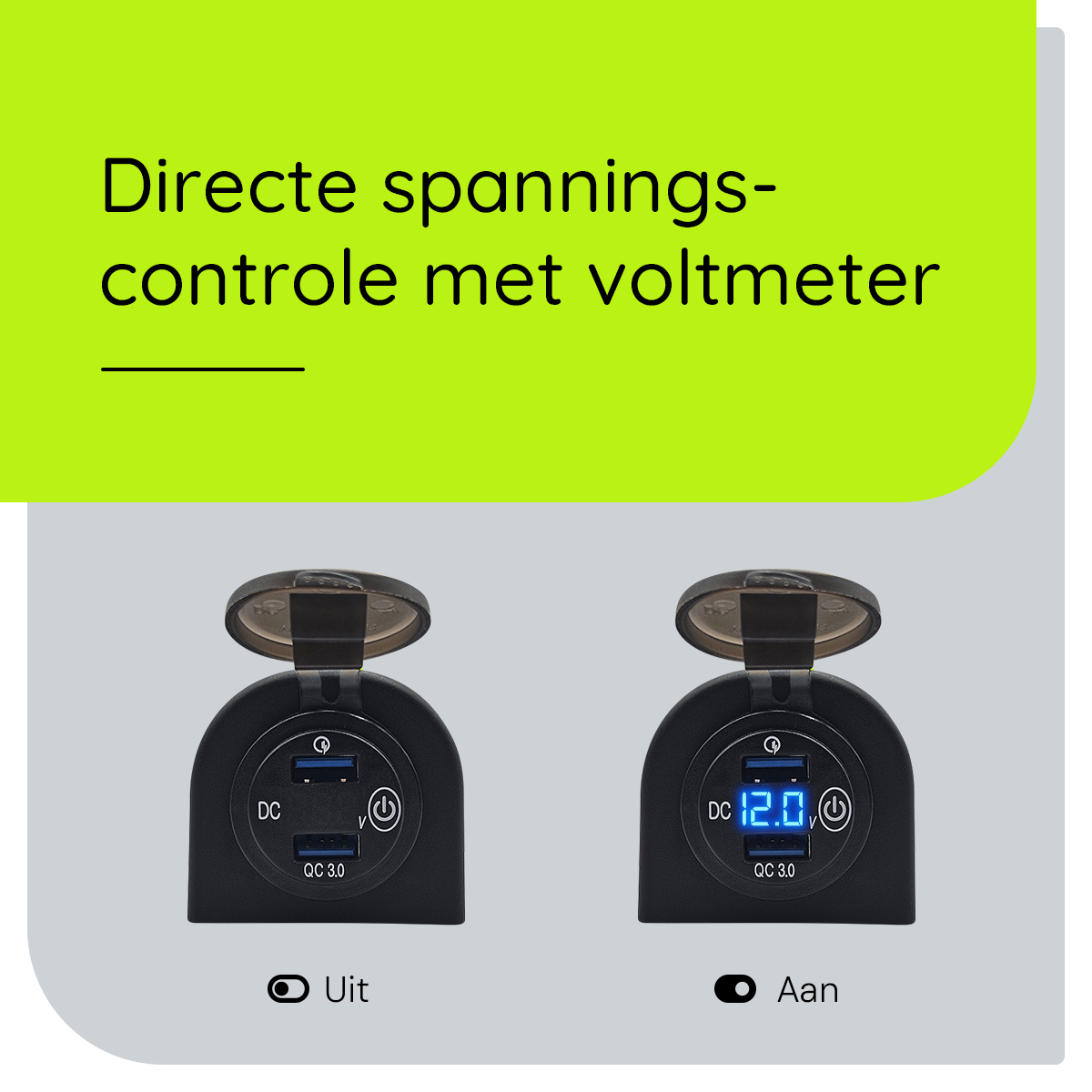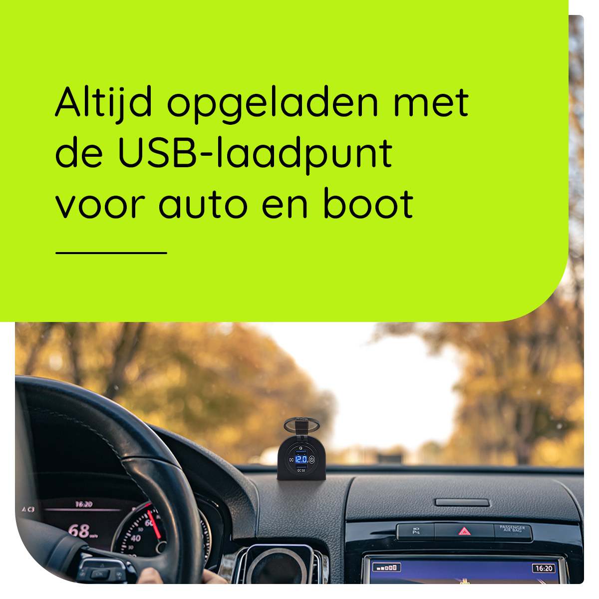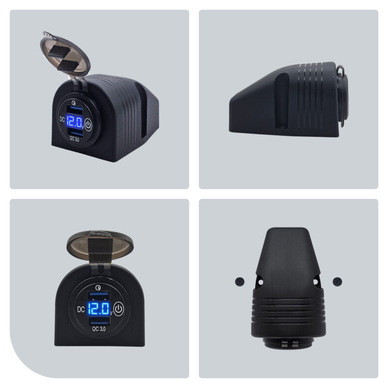 Monteer de autolader op een geschikte plaats in je voertuig en sluit deze aan op een 12V bron. Gebruik de USB-poorten om je apparaten op te laden en de schakelaar om de stroomtoevoer naar de lader te regelen. De voltmeter activeert automatisch om je real-time informatie over de staat van de accu te geven.