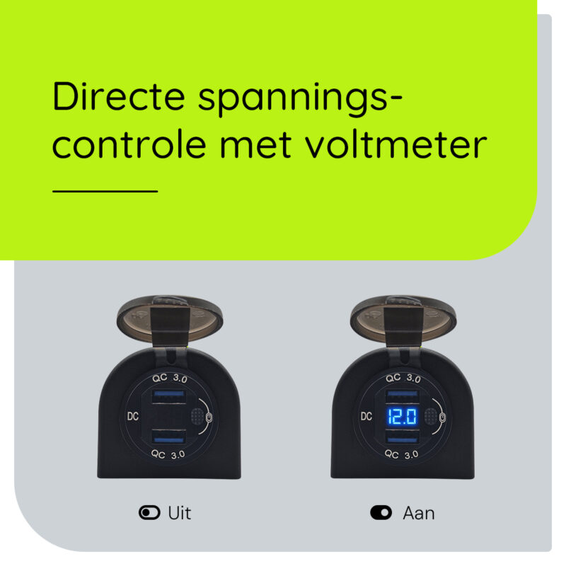 - Extra functies: Schakelaar en ingebouwde voltmeter