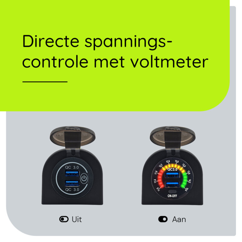 - Extra functies: Schakelaar en ingebouwde voltmeter