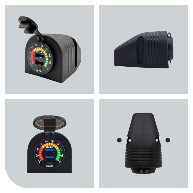 Monteer de autolader op een geschikte plaats in je voertuig en sluit deze aan op een 12V bron. Gebruik de USB-poorten om je apparaten op te laden en de schakelaar om de stroomtoevoer naar de lader te regelen. De voltmeter activeert automatisch om je real-time informatie over de staat van de accu te geven.