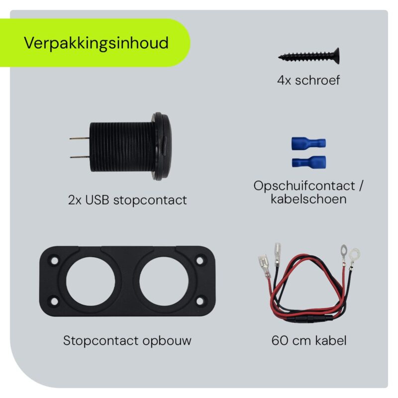 | Verpakkingsinhoud | 2x USB stopcontact; 2x stofkapje; 2x aansluitring; 1x inbouw montageplaat; 1x aansluitkabel; 4x schroeven; 4x kabelschoenen, 1x 10A glaszekering |