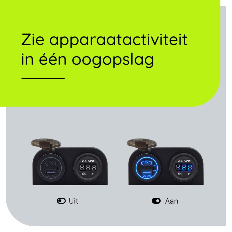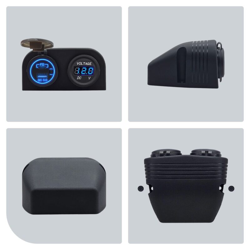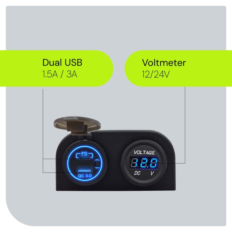 ProRide 12V USB/USB C Stopcontact 2 Poorten Opbouw met Schakelaar – QC3.0 – Tweevoudig opbouw met Voltmeter – Blauw