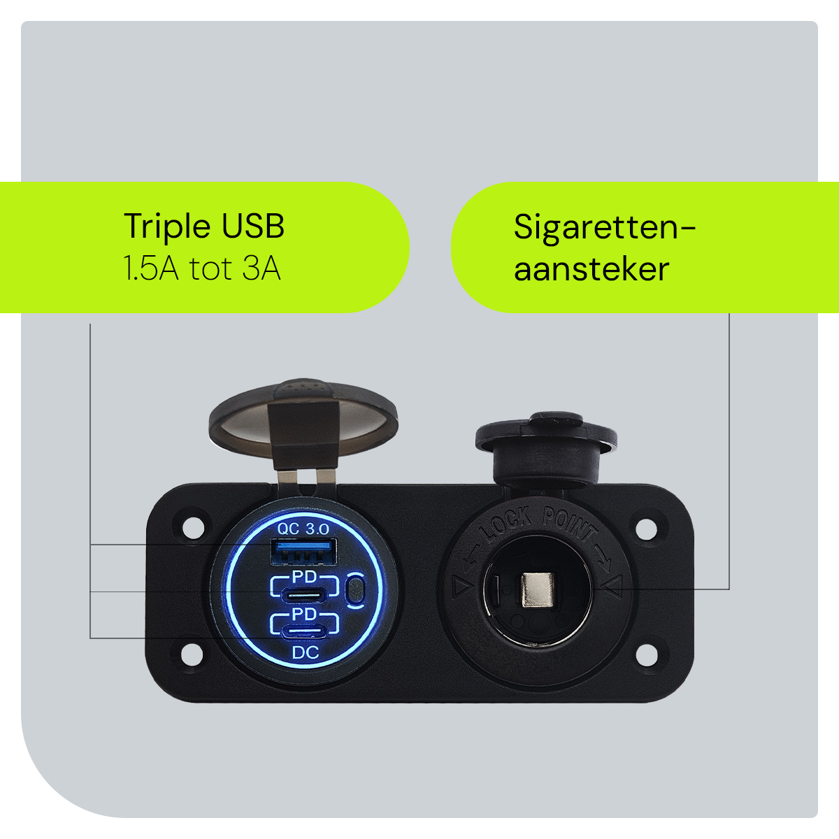 Upgrade je voertuig met het ProRide 12V USB Stopcontact, ideaal voor auto’s, vrachtwagens, boten, caravans en campers. Dit moderne stopcontact is uitgerust met drie USB-laadpunten met Quick Charge 3.0 technologie en een 12V/24V sigaretten stopcontact voor snelle en efficiënte energievoorziening.