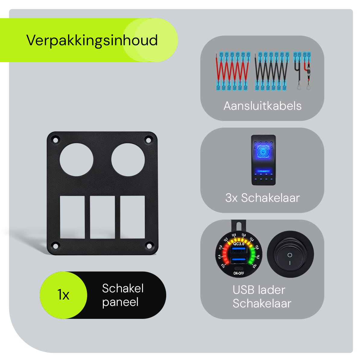 ProRide Schakelpaneel 12V voor Auto/Boot – USB Lader 2 Poorten met Schakelaar – QC3.0 – 3 schakelaars