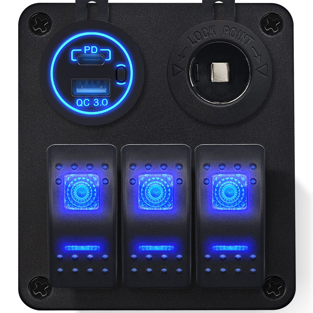 ProRide Schakelpaneel 12V voor Auto/Boot – USB/USB C Lader 2 Poorten met Sigaretten stopcontact – QC3.0 – 3 schakelaars
