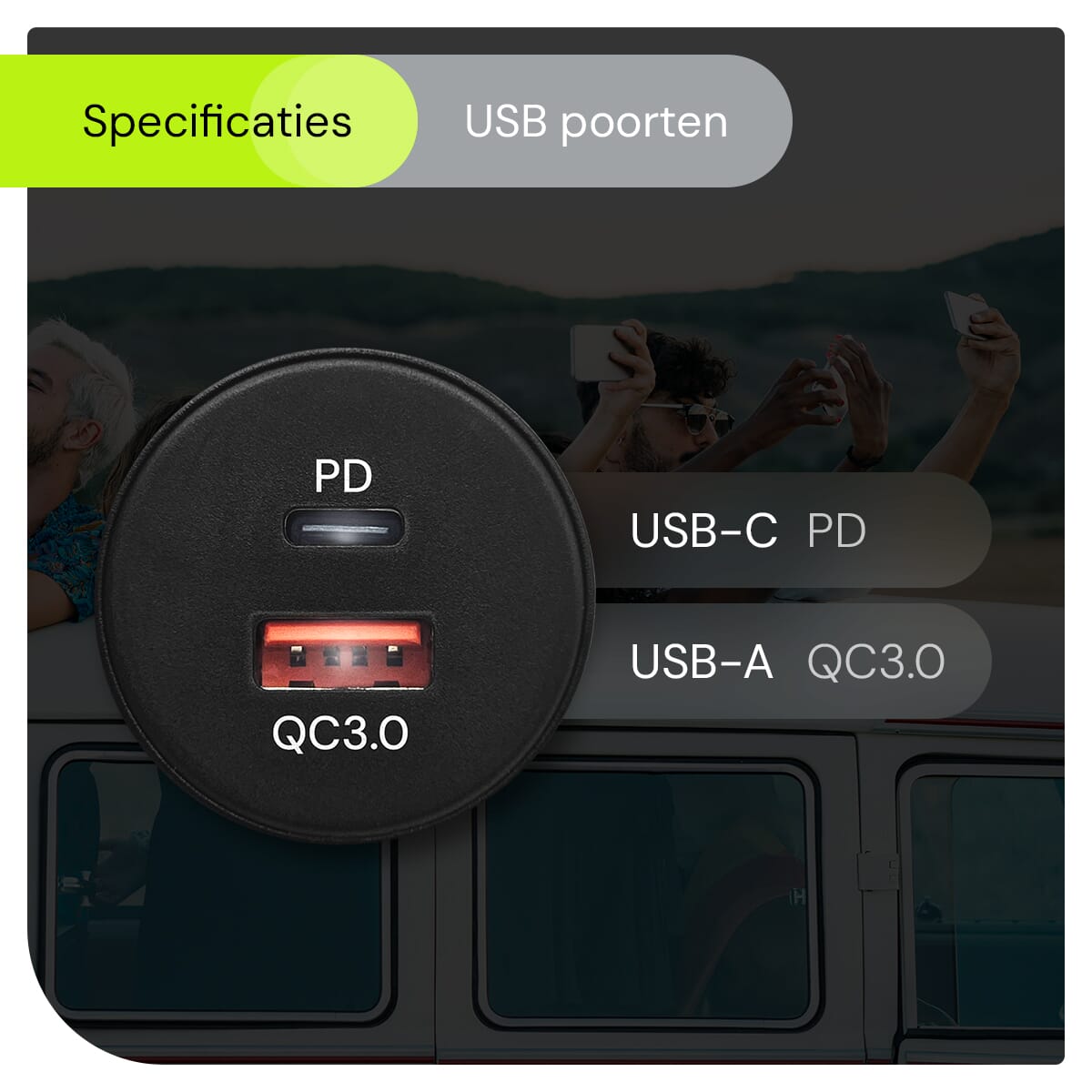 Met zowel een USB C als een USB A poort kun je twee apparaten tegelijkertijd opladen. Dit is ideaal voor lange ritten waarbij je meerdere apparaten nodig hebt, zoals een telefoon en een navigatiesysteem.