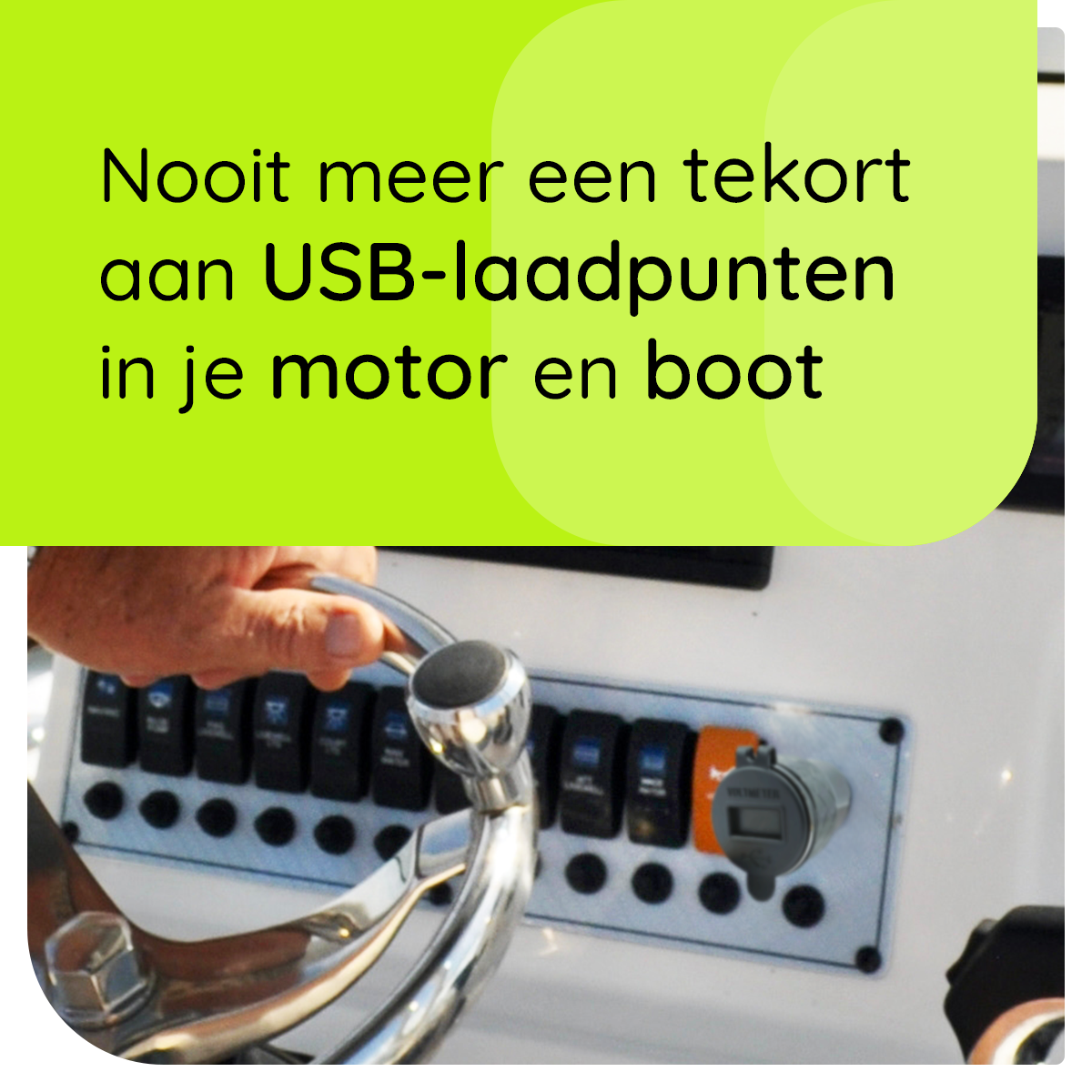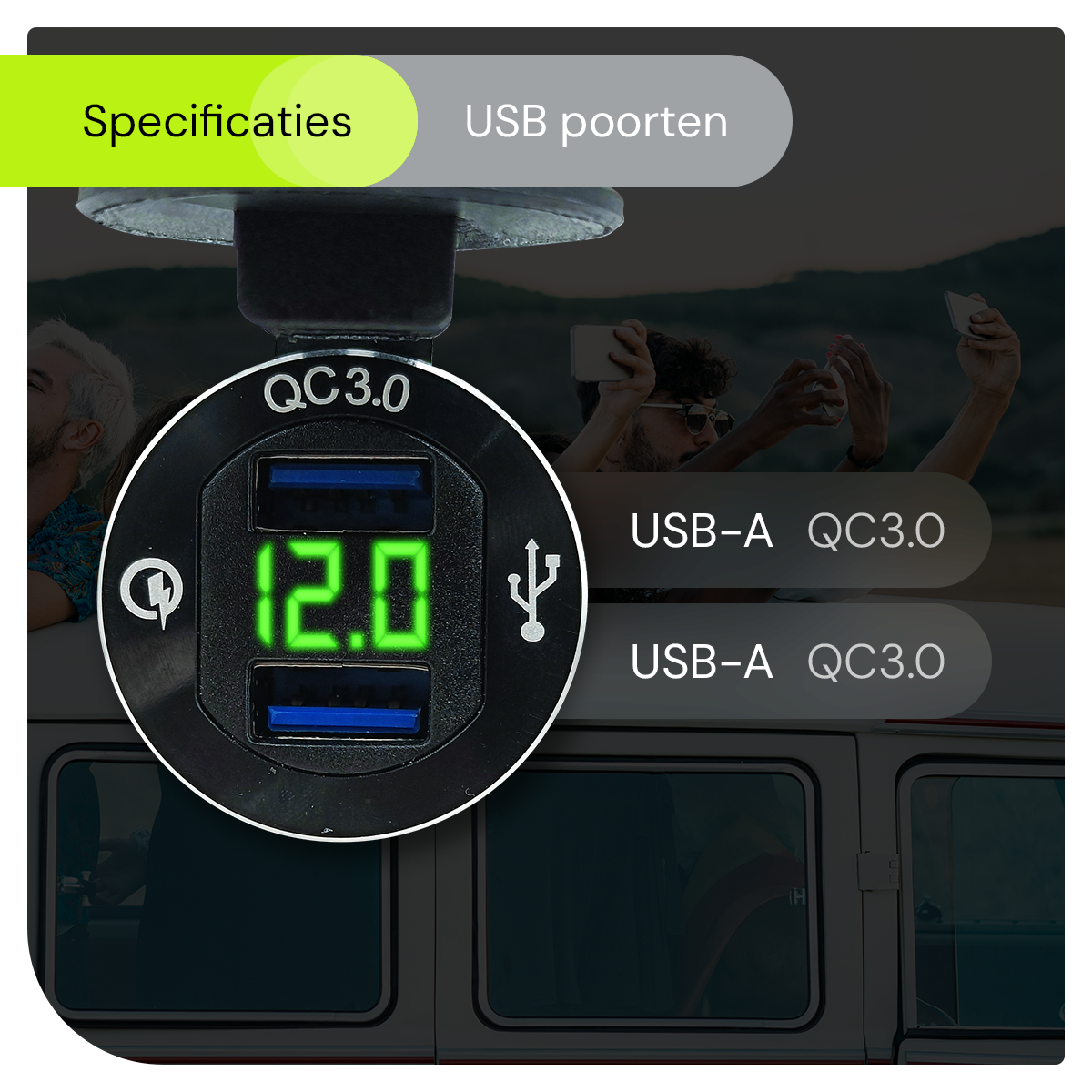 - Dubbele poorten: Met 2 USB-poorten kun je meerdere apparaten tegelijk opladen, ideaal voor het delen van stroom met je mede-rijders of het opladen van meerdere apparaten.
