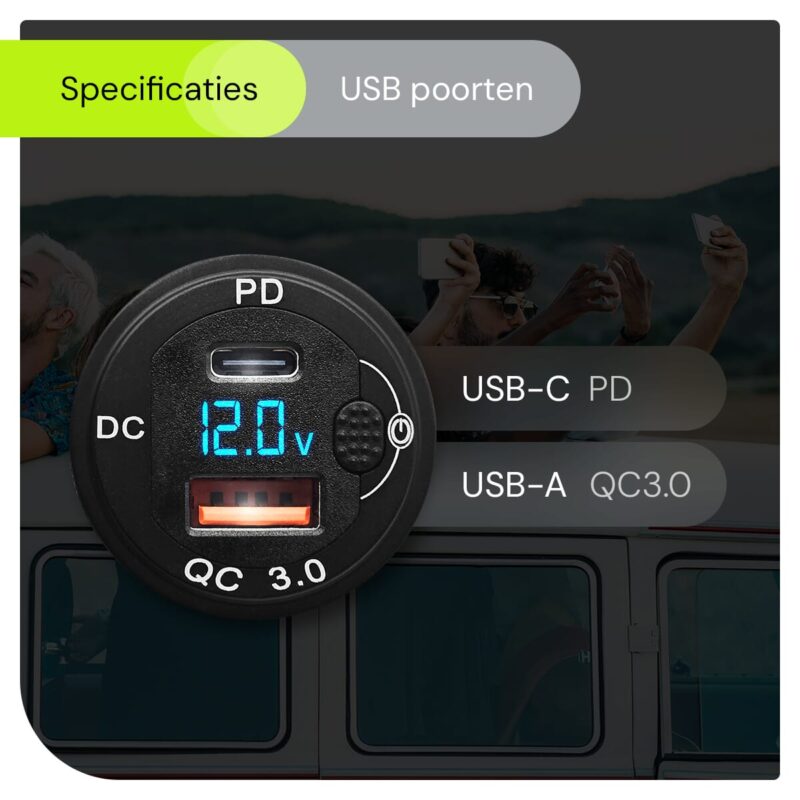 ProRide USB Lader Motor met Voltmeter/Schakelaar – Din Hella – PD/QC3.0 – 12V/24V – Motor USB C lader 2 poorten – Blauw