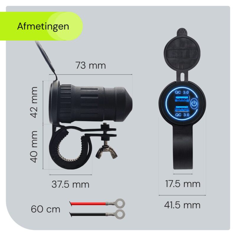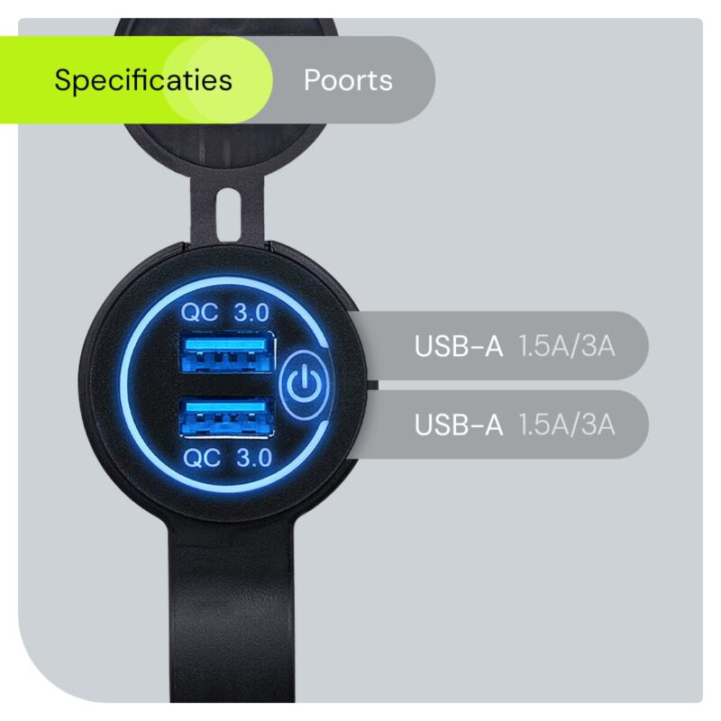 12V USB Lader Motor – USB Aansluiting Motor – 2 Poorten met Schakelaar – QC3.0 – Voor Motor en Motorfiets – Blauw