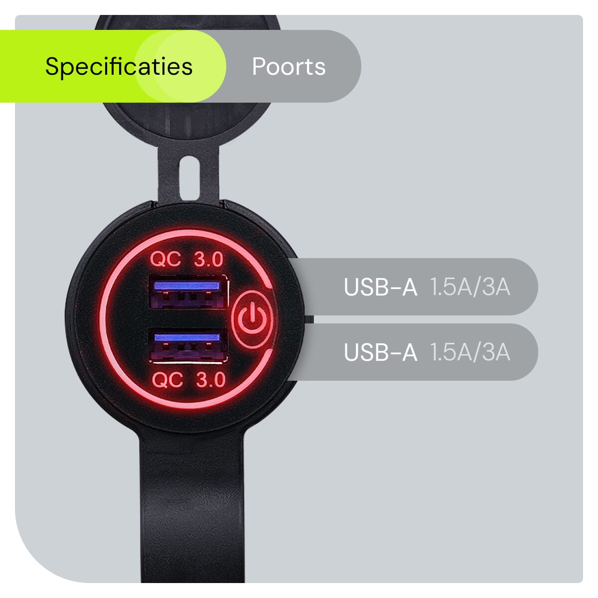 - USB Uitgangen: 2 poorten, ondersteunt Quick Charge 3.0