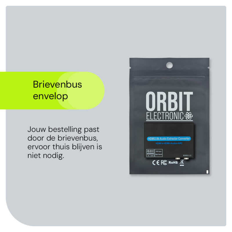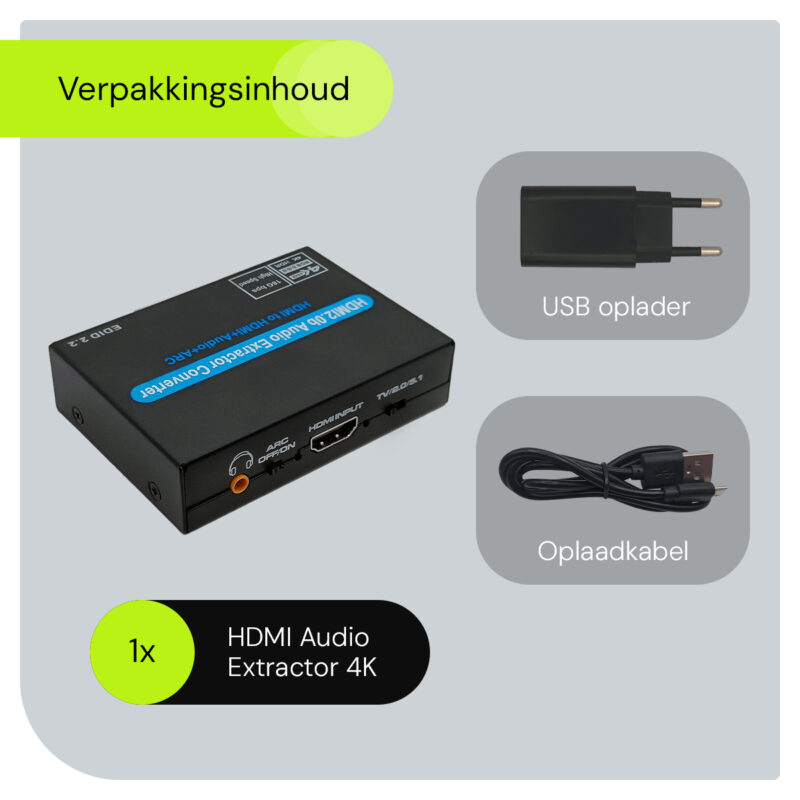 - Verpakking: HDMI Extractor, USB-laadkabel, USB-oplader; handleiding