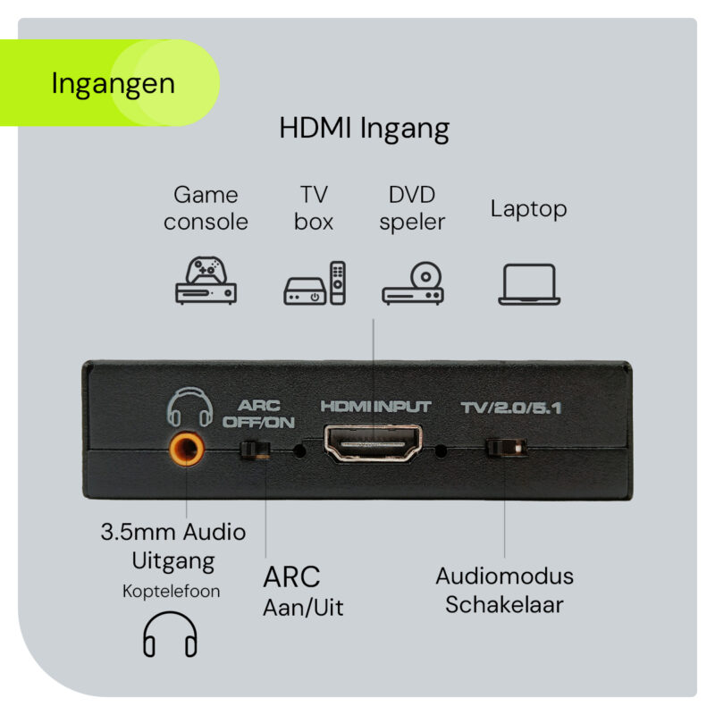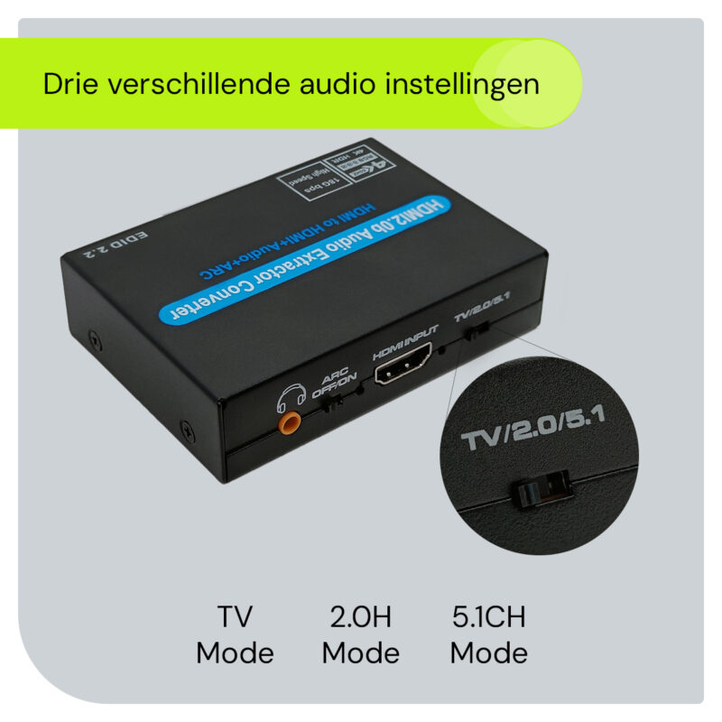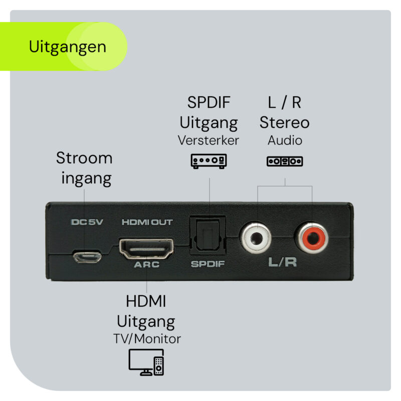 - Meerdere audio-uitgangen: Biedt zowel L/R als ARC audio-uitgangen voor maximale flexibiliteit.