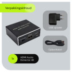 - Verpakking: HDMI Extractor, USB-laadkabel, USB-oplader; handleiding