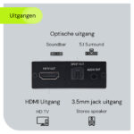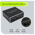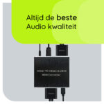 Deze HDMI Audio Extractor is compatibel met een breed scala aan apparaten, waaronder TV’s, laptops, PC’s en gameconsoles. Of je nu een filmavond organiseert of een intense gamesessie hebt, deze extractor zorgt ervoor dat je altijd het beste geluid hebt. Bovendien ondersteunt het zowel 3.5mm jack audio als optische audio-uitgangen, zodat je de vrijheid hebt om de geluidsbron te kiezen die het beste bij je past.