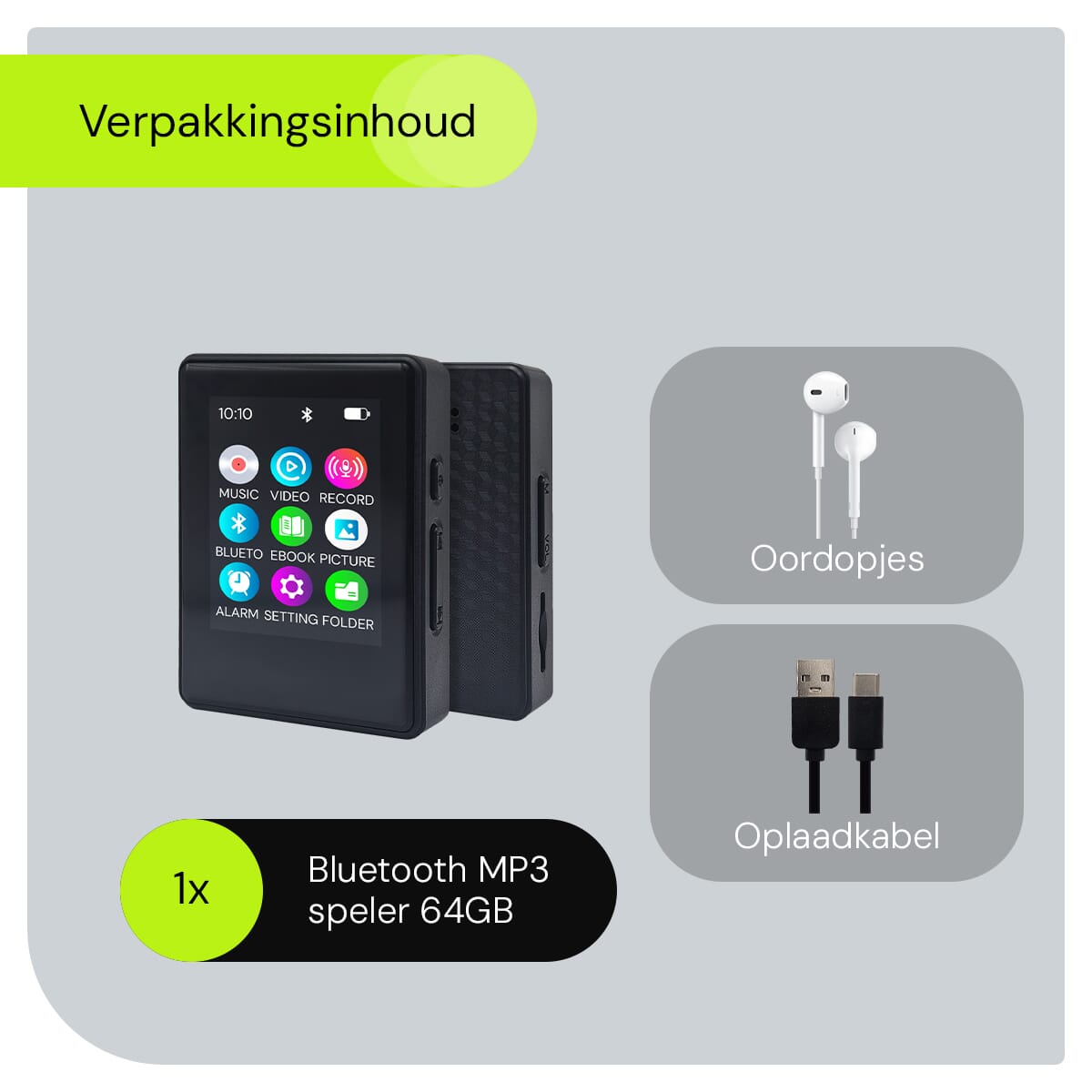 - Inclusief: MP3 speler, oordopjes, USB oplaadkabel