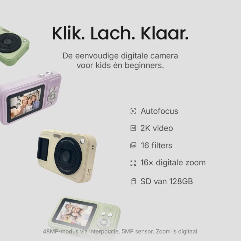- Stijlvol en compact: Het compacte formaat en de vrolijke kleuren maken de camera perfect om mee te nemen tijdens uitstapjes, vakantie of dagelijkse avonturen.