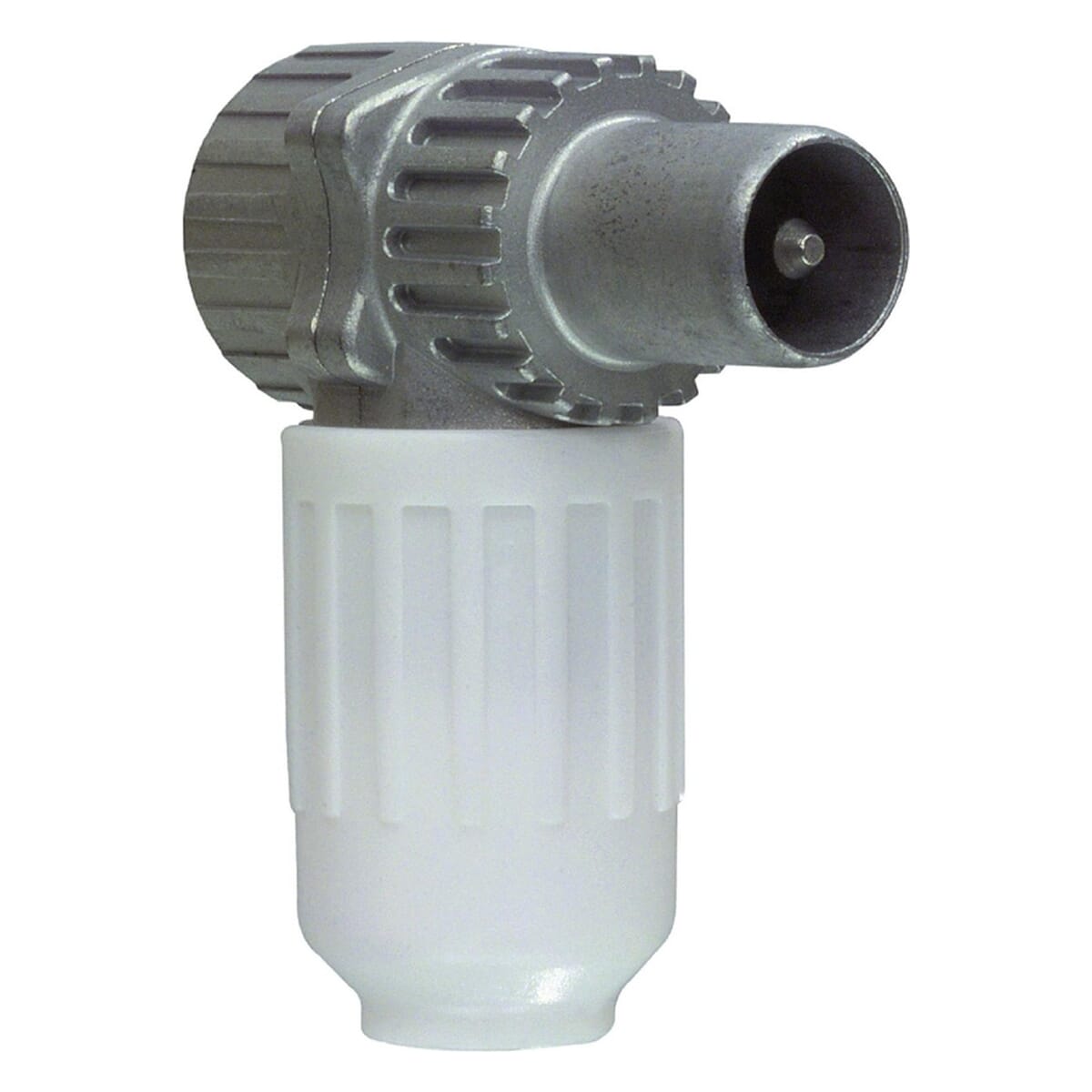 De connector wordt aan het uiteinde van een coaxiale kabel bevestigd. De haakse male aansluiting wordt vervolgens in de female ingang van een apparaat gestoken, zoals een televisie of radio. Dit zorgt voor een stevige en betrouwbare verbinding.