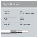 De coaxkabel TV van 1 meter is ontworpen voor het verbinden van televisies met antennes of andere signaalbronnen. Deze kabel is voorzien van een rechte male naar rechte female connector en is geschikt voor zowel binnen- als buitengebruik. Met een impedantie van 75 Ohm en een kern van massief koper, biedt deze kabel een betrouwbare signaaloverdracht zonder storingen.