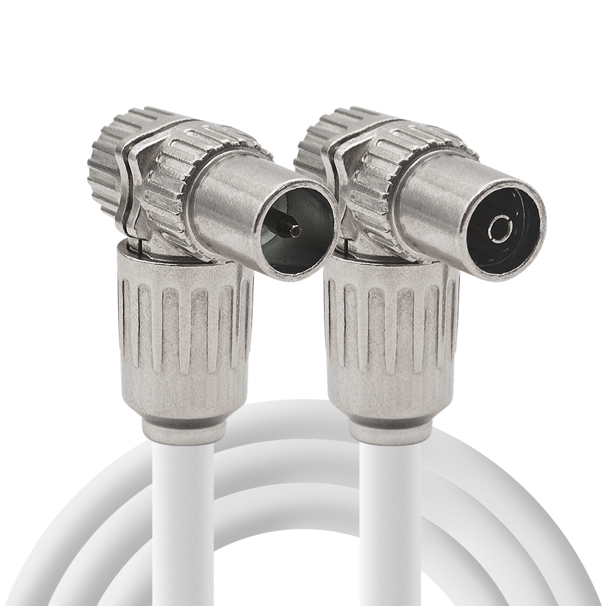 De coaxkabel werkt door het overbrengen van TV-signalen van de antenne naar de televisie. De haakse connectoren maken het mogelijk om de kabel eenvoudig aan te sluiten, zelfs in beperkte ruimtes, zonder de kabel te buigen of te beschadigen.