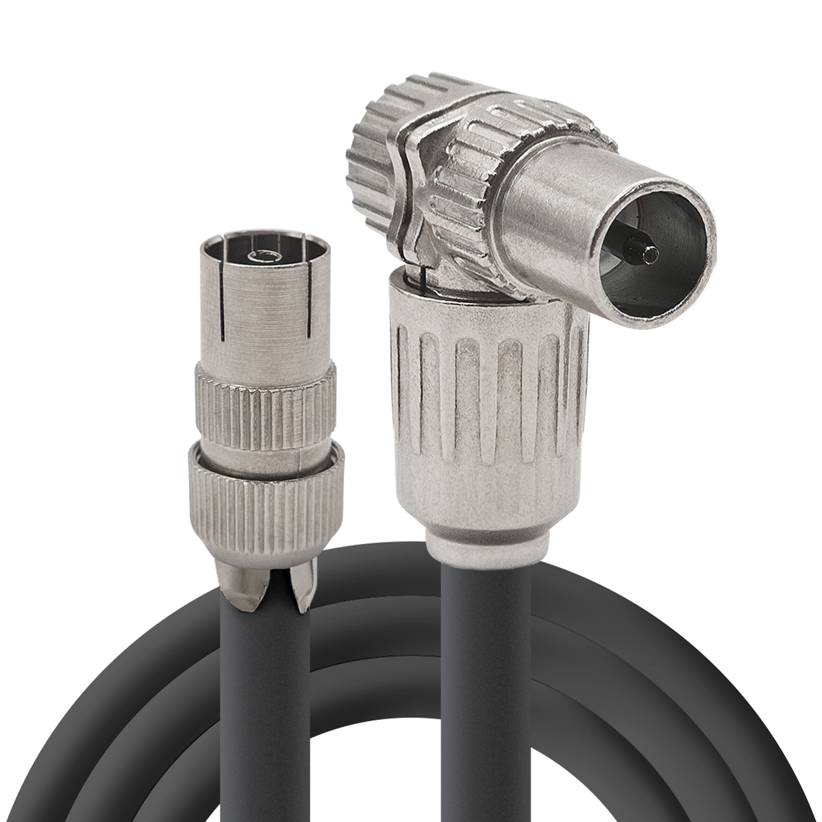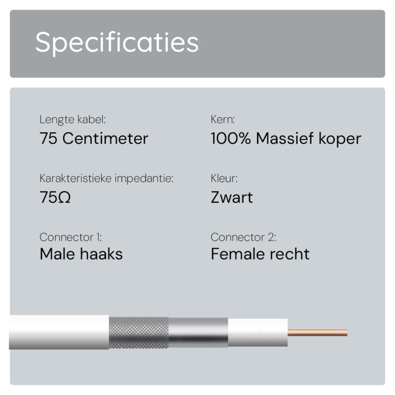De kabel is uitgerust met een rechte female en een haakse male coax stekker, wat flexibiliteit biedt bij het aansluiten op verschillende apparaten en in krappe ruimtes.