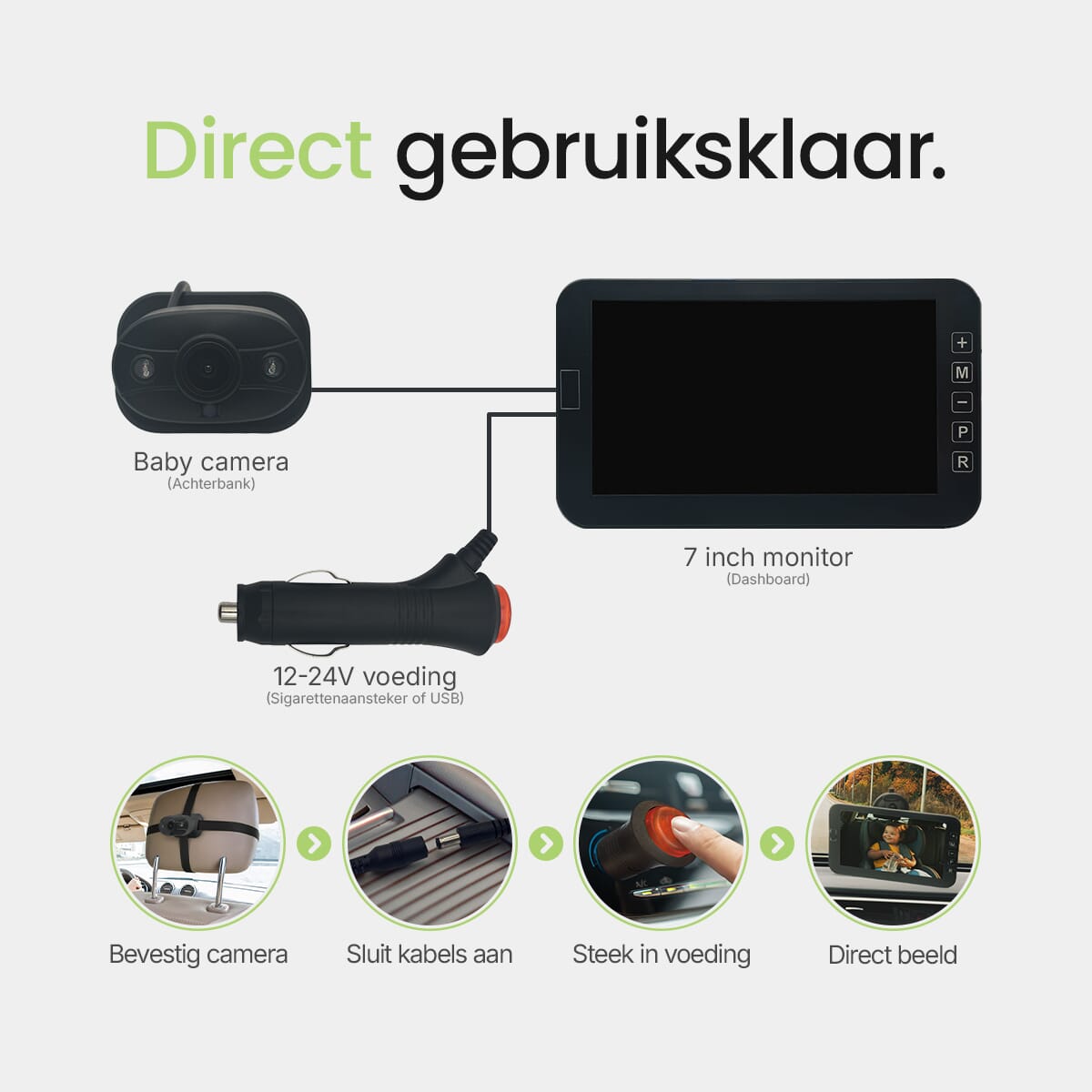 De camera en monitor zijn bedraad aangesloten voor een stabiele en storingsvrije verbinding. Geen vertraging, geen wegvallend signaal – altijd direct beeld van je kindje. Het systeem sluit je eenvoudig aan op stroom en is direct klaar voor gebruik.
