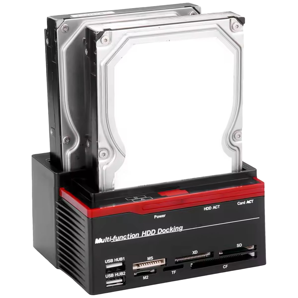 Met het All-in-One Dual HDD Docking Station + Kaartlezer kan je moeiteloos bestanden van je laptop naar een harde schijf overzetten. Dit docking station is ontworpen om eenvoudig en snel data te beheren, ideaal voor back-ups en dataherstel.